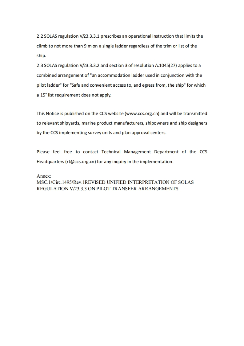 CCSTechnical Information(2017)Technical Information No.12 Total No.260Feb.28,2017(Total 2 pages)To:Relevant departments of the Headquarters of CCS,the Society's surveyors,PlanApproval Centers,related shipowners,ship management companies,shipyards anddesignersNotice on issuance of revised unified interpretation of SOLASregulation V/23.3.3 on pilot transfer arrangements by IMO(MSC.1/Circ.1495/Rev.1)1.BackgroundThe Maritime Safety Committee,at its ninety-seventh session(21 to 25 November2016),approved a Revised unified interpretation of SOLAS regulation V/23.3.3 onPilot transfer arrangements,i.e.MSC.1/Circ.1495/Rev.1 (See the Annex).Thiscircular supersedes MSC.1/Circ.1495,which revised the unified interpretation ofSOLAS regulation V/23.3.3.1 in MSC.1/Circ.1495.This IMO circular states theoperational instruction that limits the climb to not more than 9 m on a single ladderregardless of the trim or list of the ship.Member States are invited by IMO to use the unified interpretation,and to bringthem to the attention of all parties concerned.2.Technical requierements2.1 Subparagraphs 1 and 2 of SOLAS regulation V/23.3.3.address two different anddistinct arrangements-the former when only a pilot ladder is provided;the latterwhen a combined arrangement of "an accommodation ladder used in conjunctionwith the pilot ladder"is provided.