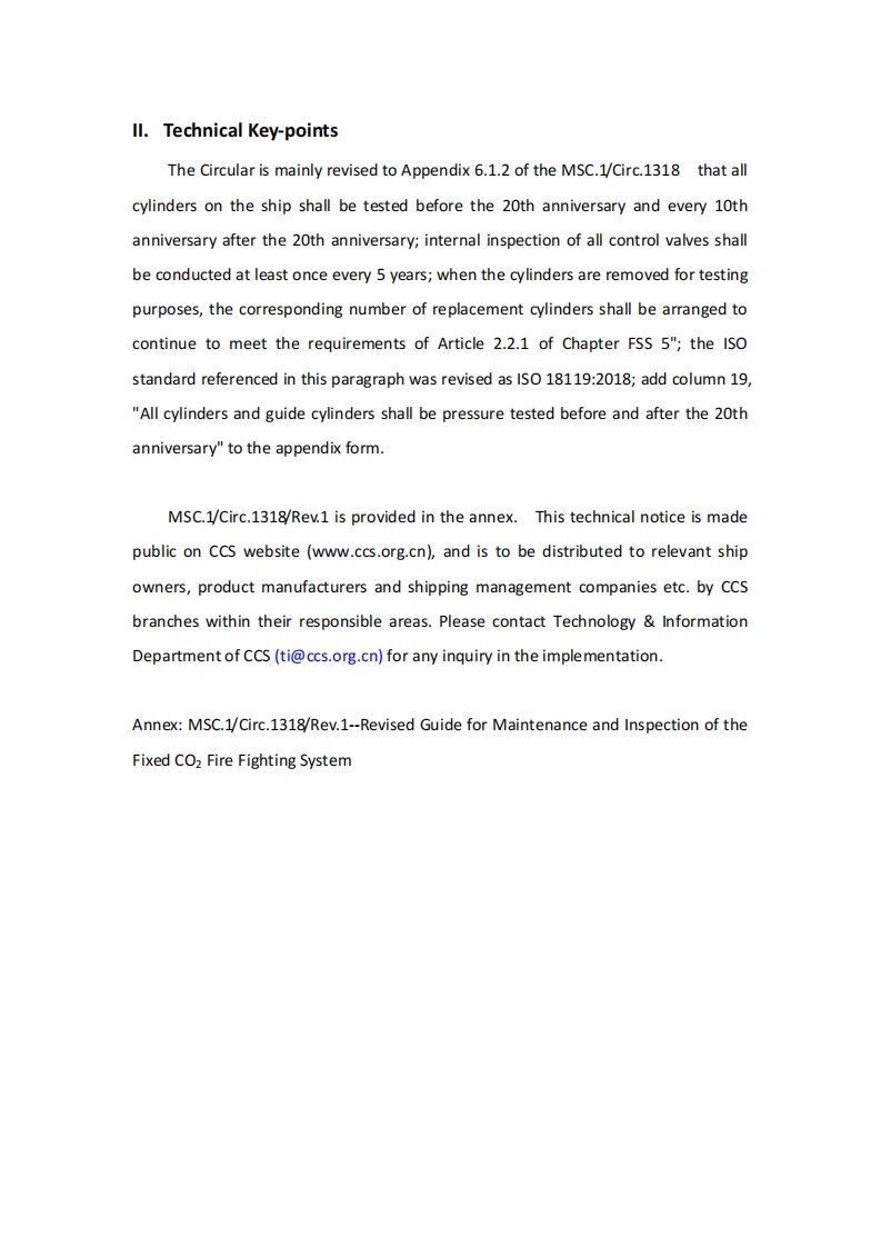 CCS技术通告Technical Information(2021)Technical Information No.65 Total No.571Dec.30,2021(Total 2 pages AnnexTo:Relevant shipowners,ship management companies,shipyards and designers,productmanufacturer,related departments of the Headquarters of CCS,the Society's surveyors,Plan Approval CentersNotice on MSC.1/Circ.1318/rev.1 Revised Guidelines for theMaintenance and Inspections of Fixed Carbon DioxideFire-Extinguishing Systems)Issued by IMOI.Preface1.1 The Maritime Safety Committee,at its eighty-sixth session(27 May to 5 June2009),approved Guidelines for the maintenance and inspections of fixed carbondioxide fire-extinguishing systems(MSC.1/Circ.1318).1.2 The Maritime Safety Committee,at its eighty-sixth session(5 May to 14 May2021),approved Guidelines for the maintenance and inspections of fixed carbondioxide fire-extinguishing systems (MSC.1/Circ.1318/Rev.1 and released on May25,2021.In order to address the need to clarify the hydrostatic testing regime forhigh-pressure CO2 cylinders and to align the relevant requirements in the Guidelineswith those in the Revised guidelines for the maintenance and inspection of fireprotection systems and appliances (MSC.1/Circ.1432).The text of the revisedguidelines for the maintenance and inspections of fixed carbon dioxidefire-extinguishing systems is set out in the annex.This circular supersedesMSC.1/Circ.1318 from the date of release.