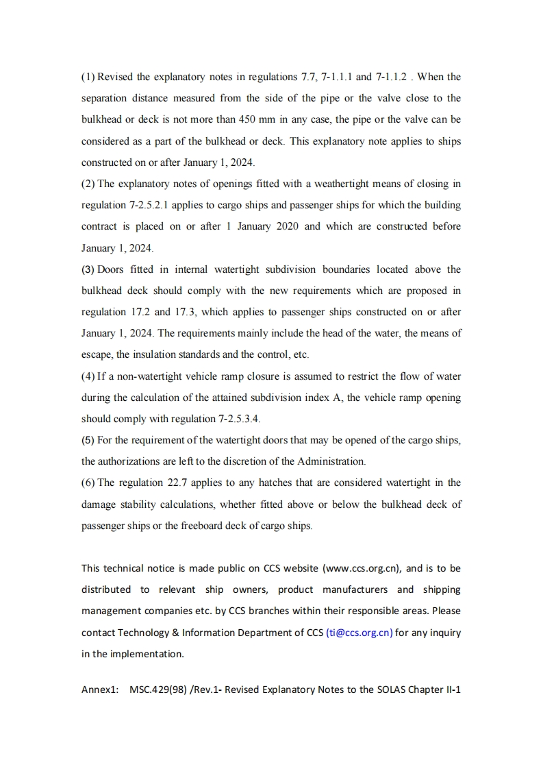 CCSTechnical Information(2021)Technical Information No.14 Total No.520Jun.28,2021(Total 2 page+Annexes)To:Relevant shipowners,ship management companies,shipyards and designers,productmanufacturer,related departments of the Headquarters of CCS,the Society's surveyors,Plan Approval CentersNotice on Revised Explanatory Notes to the SOLAS Chapter ll-1Subdivision and Damage Stability Regulations ofMSC.429(98)/Rev.1 and MSC.429(98)/Rev.21.BackgroundThe Maritime Safety Committee of International Maritime Organization (IMO),at its102th session(11 November 2020),adopted the Resolutions MSC.429(98)/Rev.1 andMSC.429(98)/Rev.2 Revised Explanatory Notes to the SOLAS Chapter II-1Subdivision and Damage Stability Regulations".MSC.429(98)/Rev.1 had enteredinto force from the date of issue.MSC.429(98)/Rev.2 will enter into force on 1January 2024.2.Main content2.1 MSC.429(98)/Rev.1 revised the explanatory notes of SOLAS II-1/17.1,paragraph 4.Doors fitted above the bulkhead deck which are required to meet bothfire protection and watertight requirements should be insulated to the standardrequired by table 9.1 and regulation II-2/9.2.2.1.1.1 or by table 9.3 and regulationII-2/9.2.2.1.1.2.The requirements of table 9.3 and regulation II-2/9.2.2.1.1.2 aboveare the new requirements.2.2 MSC.429(98)/Rev.2 revised the explanatory notes of SOLAS II-1 as follows: