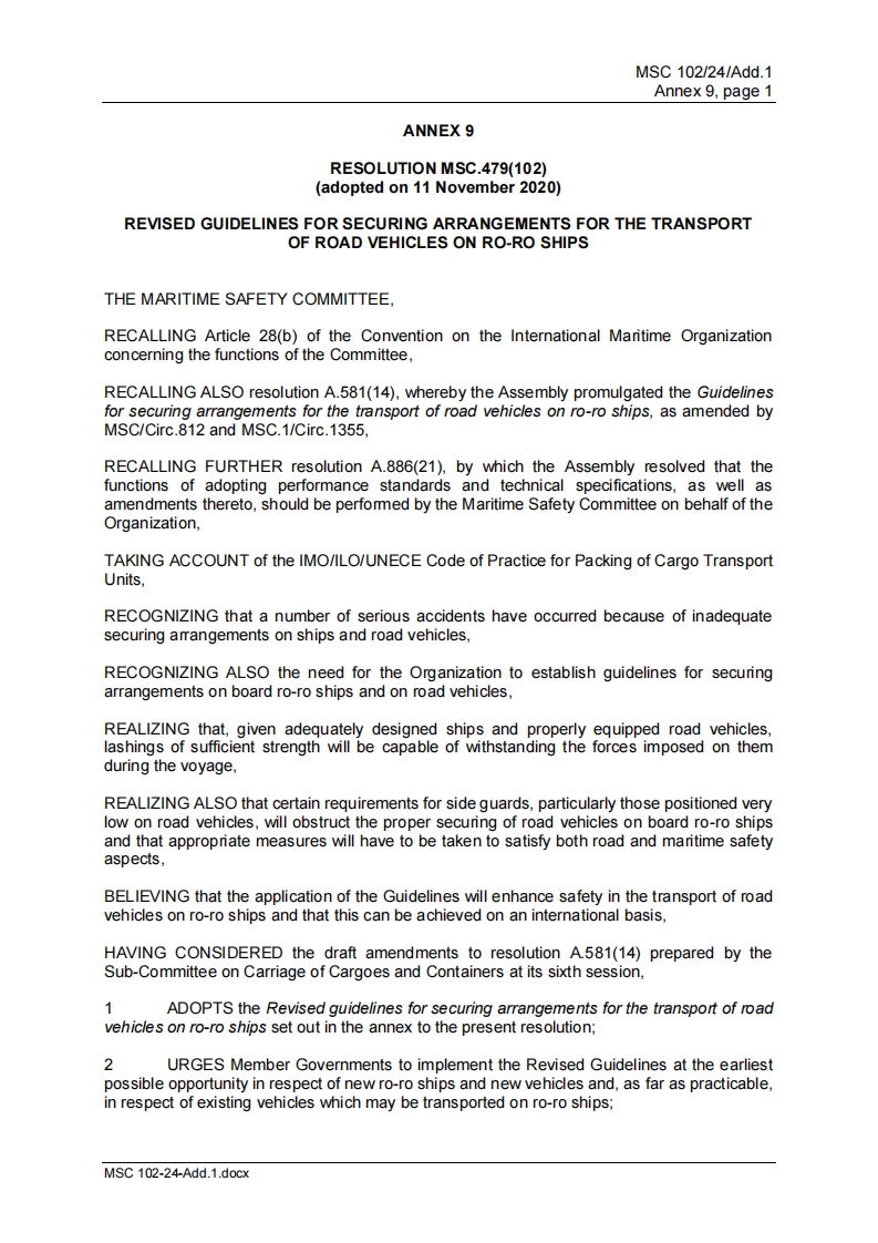 CCSTechnical Information(2021)Technical Information No.27 Total No.533Jul.15,2021(Total 1 page+Annex)To:Relevant shipowners,ship management companies,shipyards and designers,productmanufacturer,related departments of the Headquarters of CCS,the Society's surveyors,Plan Approval CentersNotice on Revised Guidelines for securing arrangementsfor the transport of road vehicles on Ro-ro ships (MSC.479(102))Issued by IMO1.BackgroundThe Maritime Safety Committee of International Maritime Organization(IMO),at its102th session (4~11 November 2020),adopted the Resolution MSC.474(102)"Revised Guidelines for securing arrangements for the transport of road vehicles onRo-ro ships",which will supersede resolution A.581(14).2.Main contentThe resolution deletes "for vehicles not exceeding 15 tonnes(GVM),lashing withlower MSL values may be used."in 6.1.This technical notice is made public on CCS website (www.ccs.org.cn),and is to bedistributed to relevant ship owners,product manufacturers and shippingmanagement companies etc.by CCS branches within their responsible areas.Pleasecontact Technology Information Department of CCS(ti@ccs.org.cn)for any inquiryin the implementation.Annex:MSC.479(102)-Revised Guidelines for securing arrangements for thetransport of road vehicles on Ro-ro ships