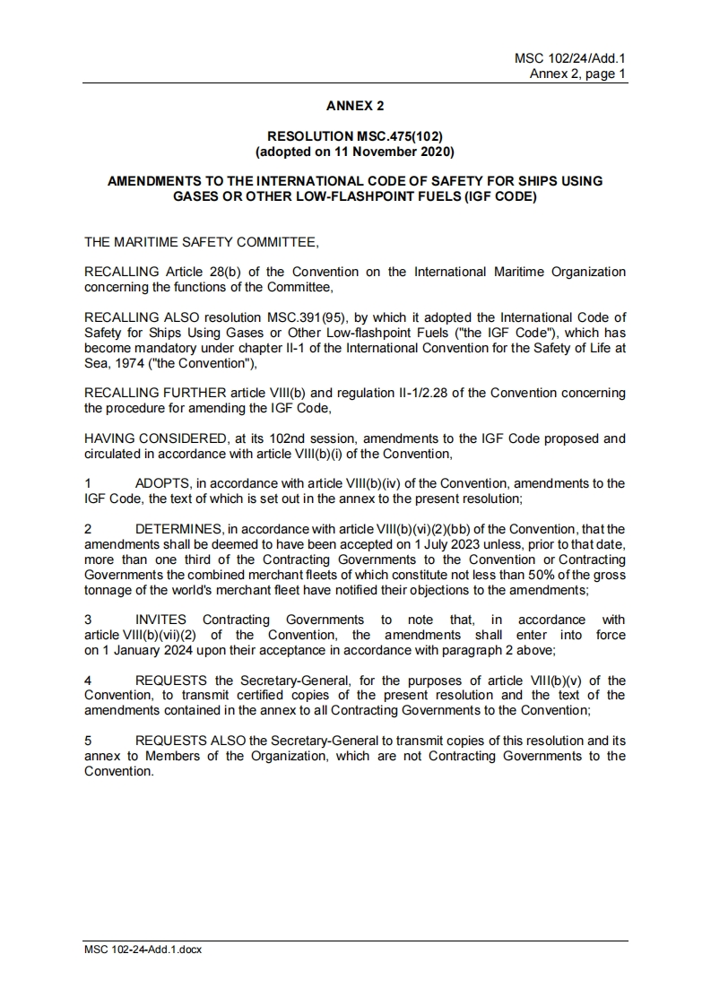 CCSTechnical Information(2021)Technical Information No.34 Total No.540Jul.28,2021(Total 1 page Annex)To:Relevant shipowners,ship management companies,shipyards and designers,productmanufacturer,related departments of the Headquarters of CCS,the Society's surveyors,Plan Approval CentersNotice on the Amendments of IGF Code (MSC.475(102))Issued by IMOThe Maritime Safety Committee,at its 102st session (4 to 11 November 2020),adopted,byresolution MSC.475(102),the amendment to the International Code of Safety for ShipsUsing Gases or Other Low-Flashpoint Fuels(IGF Code)(MSC.391(95)).The amendment isexpected to enter into force on I January 2024.The main contents of the amendment are asfollows:1.Replacing paragraph 6.7.1.1 to delete the requirement that interbarrier spaces shall also beprovided with a suitable pressure relief system;2.Adding paragraph 11.8 to supplement regulations for fuel preparation roomfire-extinguishing systems;3.Replacing paragraph 16.3.3.5.1 to replace "For aluminium alloys"in original text by "Formaterials such as aluminium alloys".This technical information is published on the CCS website (www.ccs.org.cn)and will betransmitted to relevant units by the CCS branches implementing the inspection and planapproval centers within their responsible areas.For any enquiry please contact theTechnology Information Department of the CCS Headquarters by e-mailing to:ti@ccs.org.cn.Annex:Resolution MSC.475(102)amendments to the international code of safety for shipsusing gases or other low-flashpoint fuels(IGF code)