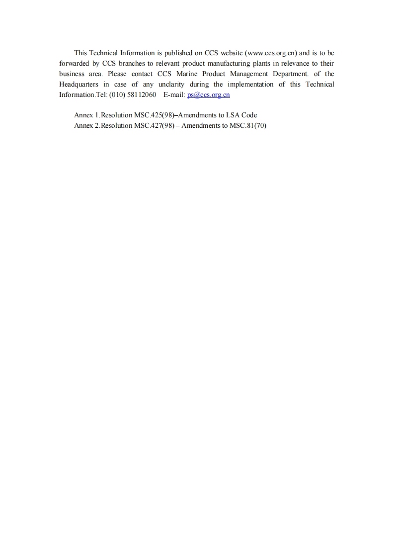 CCS Technical Information(2017)Technical Information No.69 Total No.317Nov11,2017(Total 2pages)To:The domestic branches and overseas centersNotice on the implementation of resolutions MSC.425(98)andMSC.427(98)The international maritime organization (IMO)adopted resolutions MSC.425(98)andMSC.427(98)on 15 June 2017,which will enter into force on I January 2020.The revision ofthe resolution relates to article 6.1 (landing and embarkation appliances)of the amendmentsto the international life saving appliance(LSA)rules and 8.1 (testing of davits and launchingappliances)in the revised test recommendations for life-saving appliance,which are moreclearly relevant than those of the original provision,such as the exempted object of the staticload test of the appliances in article 8.1 of the LSA rule 6.1 and the revised rescue equipmenttest case,not just the winch brake but the winch;The structural members of LSA rules in theform of brackets indicate including winch structural members,the specific amendments are asfollows:1.chapter VI of the international life saving appliance (LSA)rules,landing andembarkation appliances 6.1.1.5 and 6.1.1.6 shall be replaced by the following:"6.1.1.5 The launching appliance and its attachments other than winches shall be ofsufficient strength to withstand a factory static proof load test of not less than 2.2 times themaximum working load.6.1.1.6 Structural members and all blocks,falls,padeyes,links,fastenings and allother fittings used in connection with launching equipment shall be designed with afactor of safety on the basis of the maximum working load assigned and the ultimate strengthsof the materials used for construction.A minimum factor of safety of 4.5 shall be applied toall structural members including winch structural components and a minimum factor of safetyof6 shall be applied to falls,suspension chains,links and blocks."2.the landing of life-saving appliance and the prototype test of embarkation appliancesfor part I of the revised test recommendations for life-saving appliances:The first sentence of paragraph 8.1.1 is amended to read as follows:"For lifeboats other than free-fall lifeboats,davits and launching appliances,exceptwinches,should be subjected to a static proof load of 2.2 times their maximum working load."In order to better implement the resolution,the implementing unit is requested toimplement the relevant requirements of MSC.425(98)and MSC.427(98)by I January 2020at the time of the certificate change,and to comply with the new requirements for acceptanceand inspection after I January 2020.