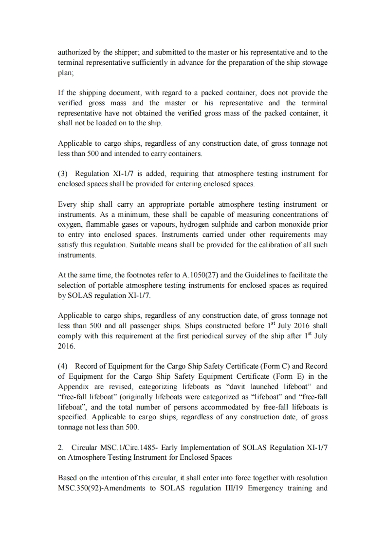 CCS技术通告Technical Information(2015)Technical Information No.24 Total No.185Jul.24,2015 (Total 3 pages)To:relevant departments of CCS Headquarters,Research and Development Centre,Rules and Technology Centre,Wuhan Rules and Research Institute,plan approvalcenters,branches,CCS surveyors,relevant shipyards,product manufacturers,shipdesigners and ship management companiesNotice on the Resolution MSC.380(94)and Circular MSC.1-Circ.1485of IMO MSC 94The 94th session of the Maritime Safety Committee of the International MaritimeOrganization (IMO MSC 94),which was held from 17 to 21 November 2014,adoptedresolution MSC.380(94)and approved circular MSC.1/Circ.1485.The mainrequirements are summarized as follows:1.Resolution MSC.380(94)-Amendments To The International Convention For The Safety OfLife At Sea(Solas),1974,as amended,which shall enter into force on 1 July 2016.(1)The existing heading of SOLAS Regulation II-2/10.5.2 "Machinery spacescontaining internal combustion machinery"is replaced by "Machinery spaces ofcategory A containing internal combustion machinery".Applicable to all passengerships and cargo ships of gross tonnage not less than 500.(2)In the amendments to Chapter VI of SOLAS,for Regulation 2 -CargoInformation,relevant requirements for mass verification of containers are added asfollows:Except for containers carried on a chassis or a trailer when such containers are drivenon or off a ro-ro ship engaged in short international voyages,the gross mass of allcontainers carrying cargo shall be verified by the shipper,either by weighing thepacked container using calibrated and certified equipment;or weighing all packagesand cargo items,using a certified method approved by the competent authority of theState in which packing of the container was completed;The shipper of a container shall ensure the verified gross mass is stated in theshipping document.The shipping document shall be signed by a person duly