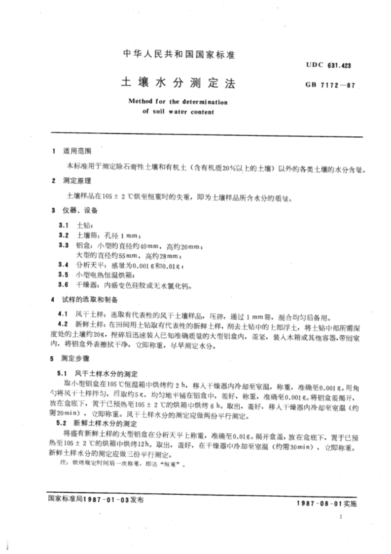 NYT52-1987土壤水分测定法348072@abc4个月前发布关注私信0.19MB4页032NYT52-1987土壤水分测定法此内容为付费资源,请付费后查看¥13¥23黄金会员免费钻石会员免费立即购买您当前未登录!建议登陆后购买,可保存购买订单付费资源 第1页 / 共4页 第2页 / 共4页 试读已结束,还剩2页,您可下载完整版后进行离线阅读 THE END标准规范 文本预览 UDC631.423B10-2GB中华人民共和国国家标准调整为y%2-9GB7172-87上海市标岸情餐研究所标准资料登记号1509年月日土壤水分测定法Method for the determination ofsoil water content1987-01-03发布1987-08-01实施国家标佳局批准 查看更多 收起部分 喜欢就支持一下吧收藏