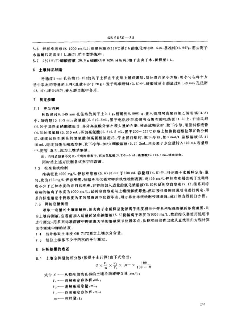 中华人民共和国国家标准UDC631.423:543.06土壤全钾测定法GB9836一88Method for determination oftotal potassium in soils1主题内容与适应范困本标准对土壤全钾测定的原理,仪器设备、样品制备,测定步骤等作了说明和规定。本标准适用于测定土壤中全钾含量。2引用标准GB7121土桌水分测定法3”测定原理土壤中的有机物先用硝酸和高氯酸加热氧化,然后用氢氯酸分解硅酸盐等矿物,硅与氟形成四氟化硅逸去,继续加热至剩余的酸被赶尽,使矿质元素变成金属氧化物或盐类。用盐酸溶液溶解残渣,使钾转变为钾离子,经适当稀释后用火馅光度祛或原子吸收分光光度法测定溶液中的钾离子浓度,再换算为土W全钾含址。不具备氢氯酸消解法条件时,可采用氢氧化钠熔融法(见附录A)。4仪器设备4.1分析天平:感量0.00018:4.2铂坩蜗或聚四氯乙烯坩埚:容积不小于30mL:4.3电热沙裕或辅有石棉布的电热板:湿度可调:4,4火馆光度计或原子吸收分光光度计:应对仪器进行调试鉴定,性能指标合格:4.5塑料移液管:10mL:4.6容量瓶:50.100、1000mL4.7刻度吸管:1,5、10mL:4.8玛研林:直径8~12cm:4.9通风街,4.10土壤筛:孔径1mm,0.149mm。5试剂5.1硝酸(GB626):分析纯,5.2高额酸(GB623):分析纯:5.3氢氟酸(GB620),分析纯;5.43m1/儿盐酸溶液:一份盐酸(GB622,分析纯)与三份去离子水混匀:5.5氧化钠溶液(NaC108L):25.4g氯化钠(GB1266,优级纯)溶于去离子水,稀释至1L:中华人民共和国农业部1988-06-30批准1989-03-01实施266