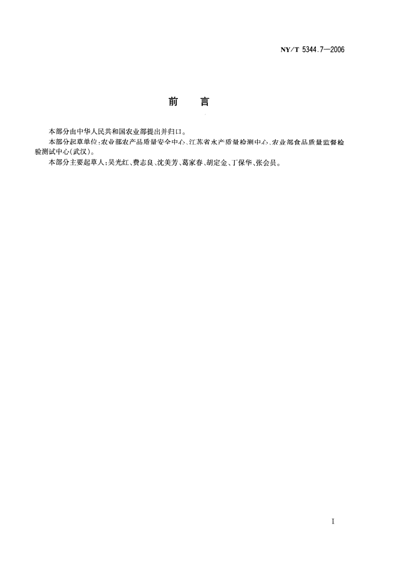 NY-T-5344-7-2006348072@abc2个月前发布关注私信0.18MB4页03315NY-T-5344-7-2006此内容为付费资源,请付费后查看¥13¥23黄金会员免费钻石会员免费立即购买您当前未登录!建议登陆后购买,可保存购买订单付费资源 第1页 / 共4页 第2页 / 共4页 试读已结束,还剩2页,您可下载完整版后进行离线阅读 © 版权声明文章版权归作者所有,未经允许请勿转载。THE END标准规范 文本预览 1Cs67.120.30X20NY中华人民共和国农业行业标准NY/T5344.7-2006无公害食品产品抽样规范第7部分:水产品2006-01-26发布2006-04-01实施中华人民共和国农业部发布 查看更多 收起部分 喜欢就支持一下吧点赞15 分享QQ空间微博QQ好友海报分享复制链接收藏