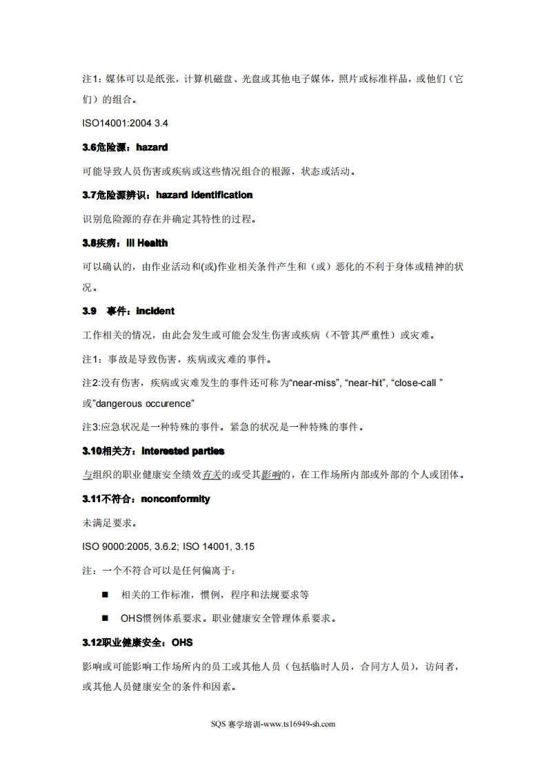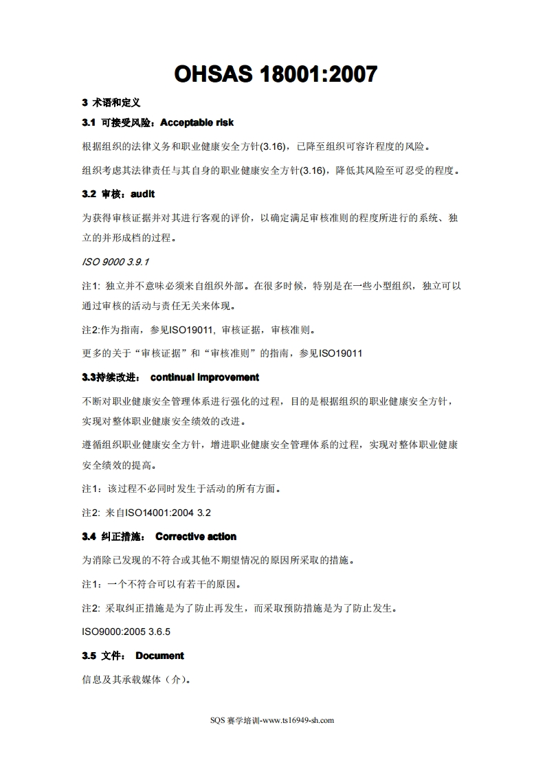 0HSAS18001:20073术语和定义3.1可接受风险:Acceptable risk根据组织的法律义务和职业健康安全方针(3.16),已降至组织可容许程度的风险。组织考虑其法律责任与其自身的职业健康安全方针(3.16),降低其风险至可忍受的程度。3.2审核:audt为获得审核证据并对其进行客观的评价,以确定满足审核准则的程度所进行的系统、独立的并形成档的过程。/S090003.9.1注:独立并不意味必须来自组织外部。在很多时候,特别是在一些小型组织,独立可以通过审核的活动与责任无关来体现。注2:作为指南,参见1S019011,审核证据,审核准则。更多的关于“审核证据”和“审核准则”的指南,参见IS0190113.3持续改进:continual Improvement不断对职业健康安全管理体系进行强化的过程,目的是根据组织的职业健康安全方针,实现对整体职业健康安全绩效的改进。遵循组织职业健康安全方针,增进职业健康安全管理体系的过程,实现对整体职业健康安全绩效的提高。注1:该过程不必同时发生于活动的所有方面。注2:来自1S014001:20043.23.4纠正措施:Corrective action为消除已发现的不符合或其他不期望情况的原因所采取的措施。注1:一个不符合可以有若干的原因。注2:采取纠正措施是为了防止再发生,而采取预防措施是为了防止发生。1S09000:20053.6.53.5文件:Document信息及其承载媒体(介)。SQS赛学培训-www.ts16949-sh.com