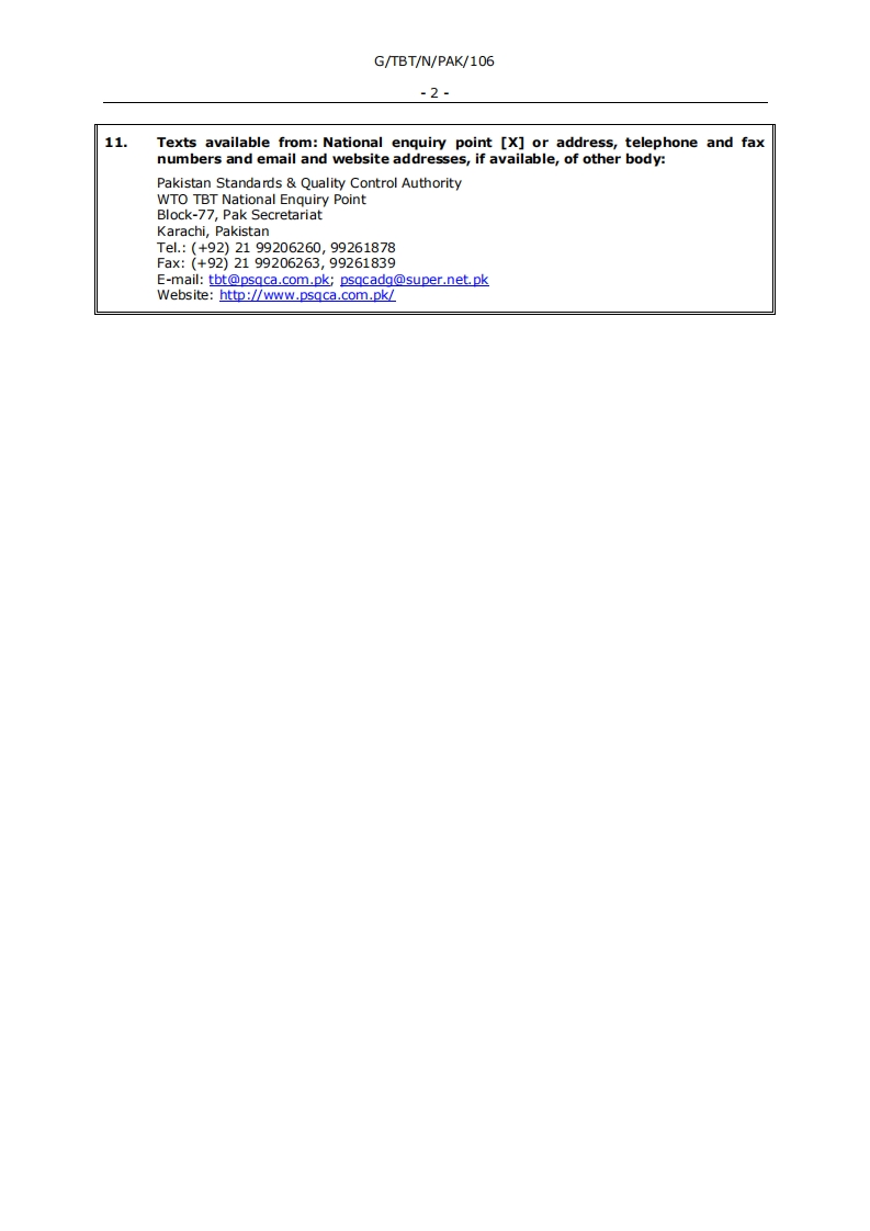 WORLD TRADEG/TBT/N/PAK/106ORGANIZATION26 October 2016(16-5879)Page:1/2Committee on Technical Barriers to TradeOriginal:EnglishNOTIFICATIONThe following notification is being circulated in accordance with Article 10.61.Notifying Member:PAKISTANIf applicable,name of local government involved (Article 3.2 and 7.2):2.Agency responsible:Pakistan Standards Quality Control AuthorityWTO TBT National Enquiry PointBlock-77,Pak SecretariatKarachi,PakistanTel.:(+92)2199206260,99261878Fax:(+92)2199206263,99261839E-mail:tbt@psqca.com.pk;psqcadq@super.net.pkWebsite:http://www.psqca.com.pk/Name and address (including telephone and fax numbers,email and websiteaddresses,if available)of agency or authority designated to handle commentsregarding the notification shall be indicated if different from above:3.Notified under Article 2.9.2 [X],2.10.1 ]5.6.2 ]5.7.1 ]other:4.Products covered (HS or CCCN where applicable,otherwise national tariff heading.ICS numbers may be provided in addition,where applicable):Household RefrigeratingAppliances Characteristics and Test Methods PS:IEC 62552(HS:84.18,ICS:97.040.30)Title,number of pages and language(s)of the notified document:HouseholdRefrigerating Appliances Characteristics and Test Methods(83 pages,in English)6Description of content:This Pakistan Standard applies to scope,classification material,design and manufacture storage temperatures,determination of dimension volumes andareas,General test condition,testing air tightness of doors and other parameters etc.7.Objective and rationale,including the nature of urgent problems whereapplicable:Energy efficiency8.Relevant documents:Government of Pakistan Gazette Notification9Proposed date of adoption:90 days after circulation by the WTO SecretariatProposed date of entry into force:90 days after circulation by the WTO Secretariat10.Final date for comments:60 days from the date of notification