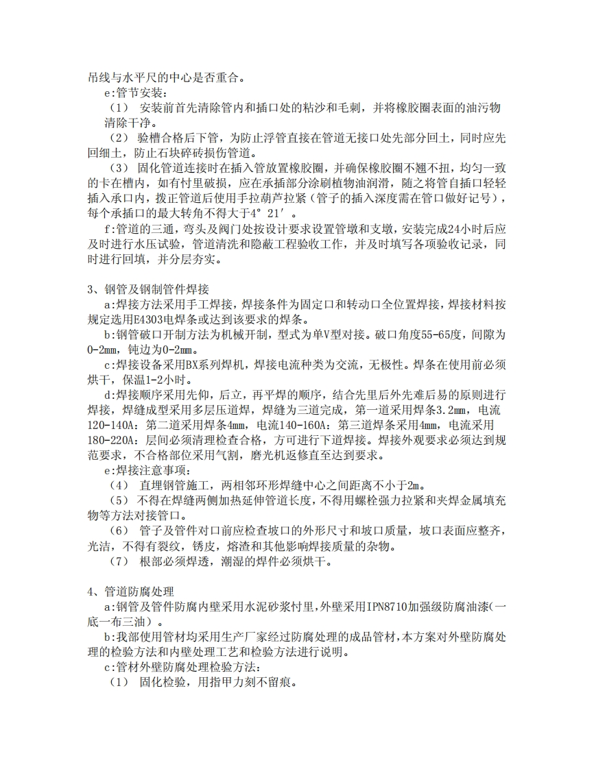 PE给水管施工技术方案一、给水管道施工工艺流程1、机械开挖至基底20cm2、人工开挖至基底3、基槽验收合格4、基础施工5、下管安装6、接口7、安装阀门,消防栓8、砌筑检查井9、管线试压10、冲洗消毒11、管道回填二、管道主要工序施工方法及要点1、基槽开挖:施工前复测准备接入的管线的位置和高程,与设计高程无误时方可进行施工(连接原有管道)。施工中执行二级测量复核制度,定期检查,做好施工的原始记录,及时进行成品测量。开槽时要认真了解交叉口的现状管线及其他障碍物,以便开挖时采取妥善的加固保护措施。b:机械开挖基槽,槽底预留20cm左右,由人工清理槽底,确保槽底原状土不受扰动。c:开挖深度为1:0.25(挖深>2.5m时,拨台宽度为0.5m),如遇土质较差时,坡度适当放大,如位置受限,需采取必要的支护,防止坍塌。d:开槽后,在下管安装前约请有关人员包括监理,业主验槽合格后方可进行下道工序。(本工程根据设计院S-R-12工程设计变更通知单要求,不需施工管基础。)2、管道施工:主管采用球墨铸铁管,橡胶圈承插接口,过桥管采用D325×8焊接钢管,沿路预埋支管采用D219×6焊接钢管。b:施工前需对管件及阀门进行试验检测,其压力等级不应低于管道工作压力的1.5倍,材料进场后及下管前要对管材及附件进行检验,包括文字证明和实物检查。c:管材在运输,装卸及堆放过程中严禁抛扔或激烈碰撞。管道的铺设应在验槽合格后方可进行,在铺设管道前要对管材,管件等重新进行一次外观检查,发现有问题的管材和管件均不得使用。d:管材的吊运及放入槽内时,应采用可靠的软带吊具,平稳下沟,不得与槽底和槽壁发生剧烈碰撞。配管时沿沟槽分散配置,减少二次搬运,为确保下管位置的准确,需在管内放置带有中心刻度的水平尺,检验时看管道坐标中心线上下垂的中心