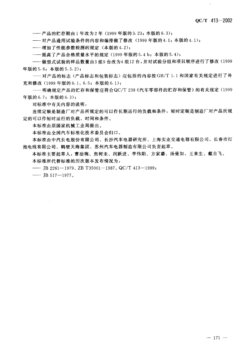 QC/T413-2002前言QC/T413一1999《汽车电气设备基本技术条件》在标准号转化前是专业标准ZBT35001一1987。因此本次标准修订实际上是在15年后对该标准的重大修改。以日本、德国及法国等国的相关标准为主要参考对象对标准进行了修改。本标准代替QC/T413一1999《汽车电气设备基本技术条件》本标准与QC/T413一1999相比主要变化如下:一取消适用于湿热型产品的规定,相应取消1999年版的3.25及3.26:一一取消长试验(1999年版的4.16):一取消电机换向器上的火花等级(1999年版的3.17,4.10):取消互换性检验(1999年版的3.22,4.14);一对产品的温度范围做了调整和修改,规定了上、下限工作温度和贮存温度的范围(1999年版的3.3;本版的3.1.3):修改了标称电压的规定,取消了6V电系,增加了工作电压范围的规定(1999年版的3.9:本版的3.1.4);一在对产品的基本性能参数的规定中,增加了对低压电线束和机械紧固件的技术要求(1999年版的3.10;本版的3.2):一一对短时定额工作时限的推荐档次做了修改,取消0.2mn,增加5s,15s(1999年版的3.8.2;本版的3.1.7.3);对产品有关部位的温升限值做了部分修改(1999年版的3.18,4.11:本版的3.3,4.3):增加了噪声试验方法的规定(见4.4)一对超速性能的规定做了补充修改(1999年版的3.16:本版的3.5,4.5);一对产品的防护性能规定做了部分修改(1999年版的3,7,4.8:本版的3,6,4.6):一一增加了产品耐异常电源电压性能(见3.7,4.7):对产品绝缘耐压性能规定中的编排和措辞进行部分变动(1999年版的3,15,4.9:本版的3.8,4.8):一对产品的防干扰性能规定做了较大修改,改为产品的电磁兼容性(1999年版的3,13;本版的3.9,4.9)一对低温试验的温度和时间规定做了修改(1999年版的4.2;本版的3.10.1,4.10.1):一对高温试验的温度和时间规定做了修改(1999年版的4.4:本版的3.10.2,4.10.2):一对温度变化试验做了部分修改,选用方法Na进行试验(1999年版的4.3;本版的3.10.3,4.10.3):一取消交变湿热试验(1999年版的3.4,4.5):一增加了产品耐温度、湿度循环变化性能(见3.11)及温度/湿度组合循环试验(见4.11);对振动试验做了较大修改,取消定频振动,增加了扫频振动的严酷度(1999年版的3.6,4.?:本版的3.12,4.12):一增加了盐雾试验的严酷度(1999年版的3.5,4.6;本版的3.13,4.13):一一增加了产品耐工业溶剂性能(见3.14,4.14):一对产品表面防护性能的内容和编排做了部分修改(1999年版的3.19,3.20,3.21,4.12:4.13:本版的3.15,4,15):一170