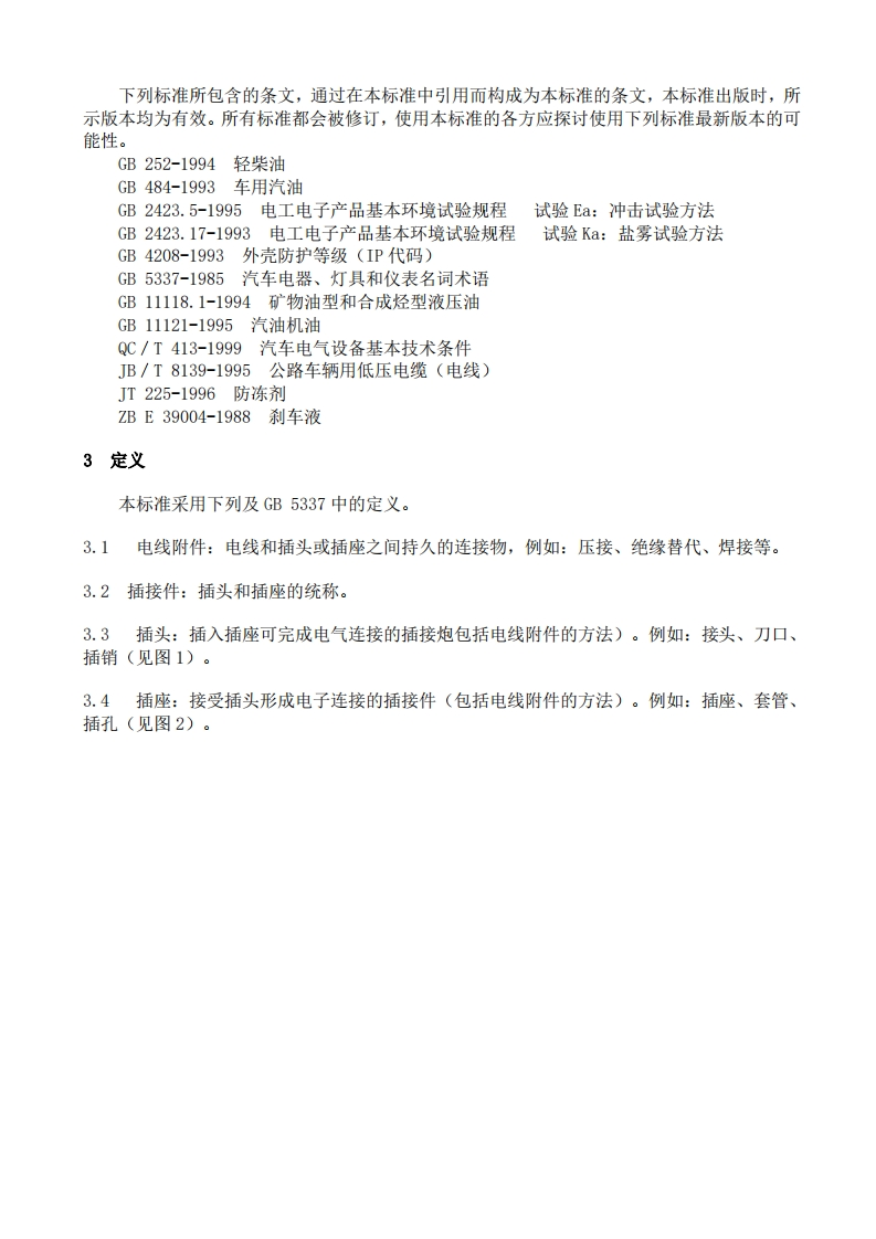 QCT417.1~417.5-2001(2001-08-21发布,2001-12-01实施)前言本标准参照IS08092.1~.4系列标准制定。本标准在车用电线束插接器的总标题下分为五部分:一一第1部分:定义,试验方法和一般性能要求(汽车部分)一一第2部分:试验方法和一般性能要求(摩托车部分)一第3部分:单线片式插接件尺寸和特殊要求一一第4部分:多线片式插接件尺寸和特殊要求一第5部分:用于单线和多线插接的圆柱式插接件尺寸和特殊要求随着我国汽车产品技术水平的不断提高,对电器插接器的要求越来越高,因此,在参照IS08092.2:1996制定车用电线束插接器试验方法和性能要求标准过程中,汽车整车厂普遍认为I$08092中对插接器性能要求较低,希望提高性能要求,而这些提高的性能要求,对于摩托车用插接器显得过高,因此,经协商将插接器试验方法和一般性能要求分汽车和摩托车两部分制定,即第1部分:定义,试验方法和一般性能要求(汽车部分),在采用IS08092.2:1996内容基础上,将部分性能要求提高并相应增加了一些性能要求及相应的试验方法,试验方法除有些直接采用国际标准的内容,其余均采用国家标准及相关行业标准。第2部分:试验方法和一般性能要求(摩托车部分),技术内容等同采用IS08092.1996。QC/T417.3~QC/T417.5分别等同采用IS08092.1、.3、.4:1996的内容。本系列标准自实施之日起同时代替QC/T417-1999,QC/T418-1999,QCn29012-1991。本系列标准由国家机械工业局提出。本系列标准由全国汽车标准化技术委员会归口。本系列标准第1部分起草单位:鹤壁天海汽车电气有限公司:主要起草人:王来生、王荣喜。本系列标准第2部分起草单位:高邮电器厂:主要起草人:何玉光、吴长红、曹俊。本系列标准第3、4、5部分起草单位:鹤壁天海汽车电气有限公司、高邮电器厂。中华人民共和国汽车行业标准车用电线束插接器QC/T417.1-2001第1部分定义,试验方法和一般性能要求代替QC/T417-1999QC/T418-1999(汽车部分)QCn29012-19911范围本标准规定了车用电线束插接器的定义,一般性能要求以及具体试验方法。本标准适用于车用电线束中的单线和多线插接器及车辆上用于维修的分离插接器。本标准不适用于直接与印制电路板连接的插接器和电子仪器的内部连接。2引用标准