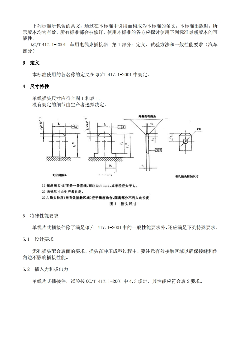QCT417.1~417.5-2001(2001-08-21发布,2001-12-01实施)前言本标准参照IS08092.1~.4系列标准制定。本标准在车用电线束插接器的总标题下分为五部分:一一第1部分:定义,试验方法和一般性能要求(汽车部分)一一第2部分:试验方法和一般性能要求(摩托车部分)一第3部分:单线片式插接件尺寸和特殊要求一一第4部分:多线片式插接件尺寸和特殊要求一第5部分:用于单线和多线插接的圆柱式插接件尺寸和特殊要求随着我国汽车产品技术水平的不断提高,对电器插接器的要求越来越高,因此,在参照IS08092.2:1996制定车用电线束插接器试验方法和性能要求标准过程中,汽车整车厂普遍认为IS08092中对插接器性能要求较低,希望提高性能要求,而这些提高的性能要求,对于摩托车用插接器显得过高,因此,经协商将插接器试验方法和一般性能要求分汽车和摩托车两部分制定,即第1部分:定义,试验方法和一般性能要求(汽车部分),在采用IS08092.2:1996内容基础上,将部分性能要求提高并相应增加了一些性能要求及相应的试验方法,试验方法除有些直接采用国际标准的内容,其余均采用国家标准及相关行业标准。第2部分:试验方法和一般性能要求(摩托车部分),技术内容等同采用IS08092.1996。QC/T417.3~QC/T417.5分别等同采用IS08092.1、.3、.4:1996的内容。本系列标准自实施之日起同时代替QC/T417-1999,QC/T418-1999,QCn29012-1991。本系列标准由国家机械工业局提出。本系列标准由全国汽车标准化技术委员会归口。本系列标准第1部分起草单位:鹤壁天海汽车电气有限公司:主要起草人:王来生、王荣喜。本系列标准第2部分起草单位:高邮电器厂:主要起草人:何玉光、吴长红、曹俊。本系列标准第3、4、5部分起草单位:鹤壁天海汽车电气有限公司、高邮电器厂。中华人民共和国汽车行业标准车用电线束插接器QC/T1417.3-2001代替QC/T417-1999第3部分单线片式插接件的尺寸和特殊要求QC/T418-1999QCn29012-19911范围本标准规定了单线片式插接件的尺寸和特殊要求。本标准适用于车用电线束中的单线片式插接器。例如附录A给定的插座,本标准还适用于车辆上用于维修的分离插接器。2引用标准