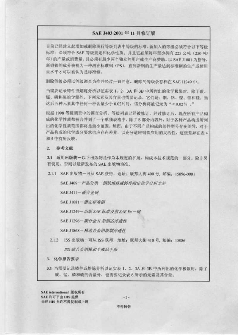 国际汽车工程师协会标准(SAE InternationalSAE J4032001年11月修订1911年06月颁布外观车辆标准2001年11月修订代替2000年6月J403SAE碳钢化学成分1.范围一194I年,SAE钢铁部门与美国钢铁学会(AISI)合作,对说明SAE钢铁成分范围的方法微了重大改动。现在应用的这一方案,从总体上说是基于较小的铸件或熔炼分析范围,附加单个样品的一定产品分析允差,代替之前在SAE钢铁中所提供的对于碳及其它元素固定的、没有允差的范围和极限。多年来,在钢铁行业中,钢铁化学成分的多样性一直是一个备受关注的问题。有观点认为如果或少钢铁生产的等级即可改进运输,提供取得先进技术、生产实践和更好质量的机会,进而更为充分地发展这些级别的内在应用的可能性。在确定众多被指定的等级中,哪些最符合大众的需求,并对混合成分的可行性有同样的要求,直接针对这一问题而进行了综合、公正地研究。通过这些研究,最常见的钢铁等级就被选出并保留在本次修订中。在这些等级中铸件或熔炼化学成分的极限或范围见表1的2、3A和3B。这些铸件或熔炼的极限或范围从于SAEJ4O9中给出的对于产品分析的标准变更。由于AISI不再发布钢铁等级规定,本文件中所列等级即为SAE等级。众所周知,对专业化的应用或加工有时还需要除前述表格中所列之外的化学成分。当需要这样的钢铁时,包含所需化学成分的元素可按以下三种方式之一来指定:(1)按最小极限(2)按最大极限,或(3)按最小和最大极限,即为范围。表4中给出碳锅不同元素的标准铸件或熔炼分析极限和范围。在该表中,范围是最小和最大极限的算术差(即0.19到0.25之间的范围是0.06)。这些铸件或熔炼的极限域范围同样以SAEJ409中给出的有关产品分析的标准变更为依据.ISTC部门1在本文件中已经设计了一个考虑到所列出等级维护的步骤。这将包括执行全行业范围内的调查以收集数据。该调查将以技术委员会认为必要的次数进行。SAE技术标准管理委员会条例规定“由SAE发行的该报告是用于改著技术和工程科学现状。关于本报告的使用完全自愿,对于本报告的任何特殊用途的应用性和适用性,包括之后引起的任何专利侵权,完全由用户独自负责,”SAE至少每5年一次对每一个技术报告进行评估,评估期间可能对内容进行重审、修订和别除,SAE欢迎您提出书面意见和建议。SAE有限公司版权所有2002版权所有,未经SAE书面许可,报告中任何部分,不得以电子、印刷版面、影印、录制或其他任何行使夏制或保存在检索系统或传播文件序号:电话:877-606-7323(美国及加拿大境内)电话:7247764970(美国境外)传真:724776-0790电邮:custsve @sae.orgSAE网址:http:∥www.sae.orgSAE international版权所有SAE许可下由HIS提供.1未经HIS允许不得复制或上网不得转售