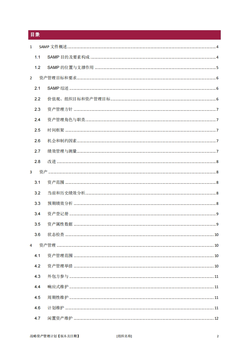 SAMP-template-ac348072@abc4个月前发布关注私信4.85MB14页035SAMP-template-ac此内容为付费资源,请付费后查看¥13¥23黄金会员免费钻石会员免费立即购买您当前未登录!建议登陆后购买,可保存购买订单付费资源 第1页 / 共14页 第2页 / 共14页 试读已结束,还剩12页,您可下载完整版后进行离线阅读 THE END标准规范 文本预览 全国资产管理标准化技术委员会National Asset Management Standardization Technical Committee(SAC/TC583)www.55000.org.cn[组织标识][组织名称]战略资产管理计划版本号本稿完成日期【年,月】至【年,月】 查看更多 收起部分 喜欢就支持一下吧收藏