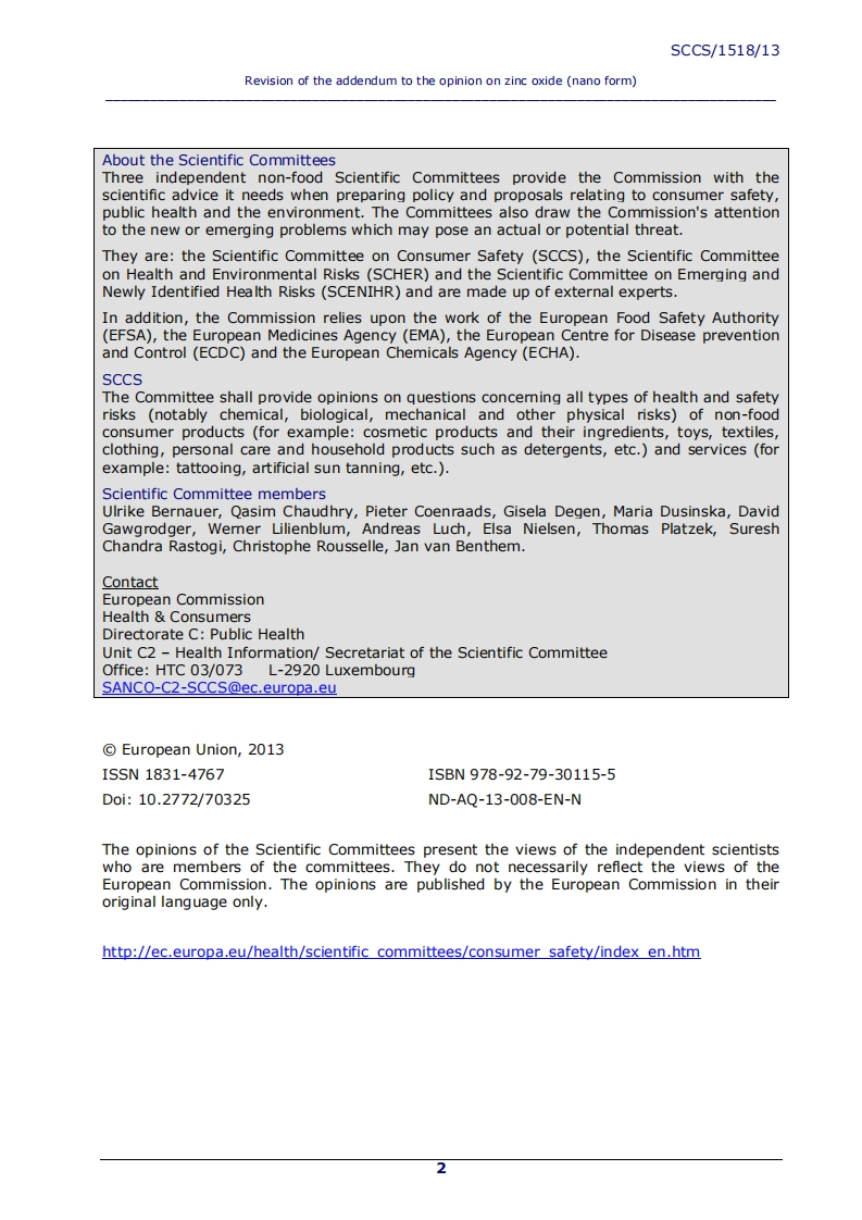 SCCS/1518/13Revision of 22 April 2014EuropeanCommissionScientific Committee on Consumer SafetysccsADDENDUM to the OPINION SCCS/1489/12 onZinc oxide (nano form)COLIPA S76The SCCS adopted this addendum by written procedure on 23 July 2013