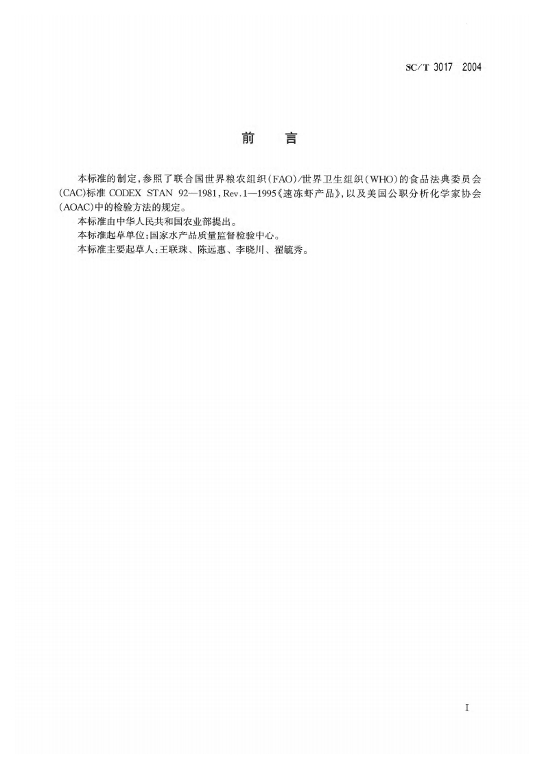 SC-T-3017-2004348072@abc4个月前发布关注私信1.17MB4页021SC-T-3017-2004此内容为付费资源,请付费后查看¥13¥23黄金会员免费钻石会员免费立即购买您当前未登录!建议登陆后购买,可保存购买订单付费资源 第1页 / 共4页 第2页 / 共4页 试读已结束,还剩2页,您可下载完整版后进行离线阅读 THE END标准规范 文本预览 ICs67.050B50SH中华人民共和国水产行业标准SC/T3017-2004冷冻水产品净含量的测定Determination of net weight in frozen fishery products2004-01-07发布2004-03-01实施中华人民共和国农业部发布 查看更多 收起部分 喜欢就支持一下吧收藏