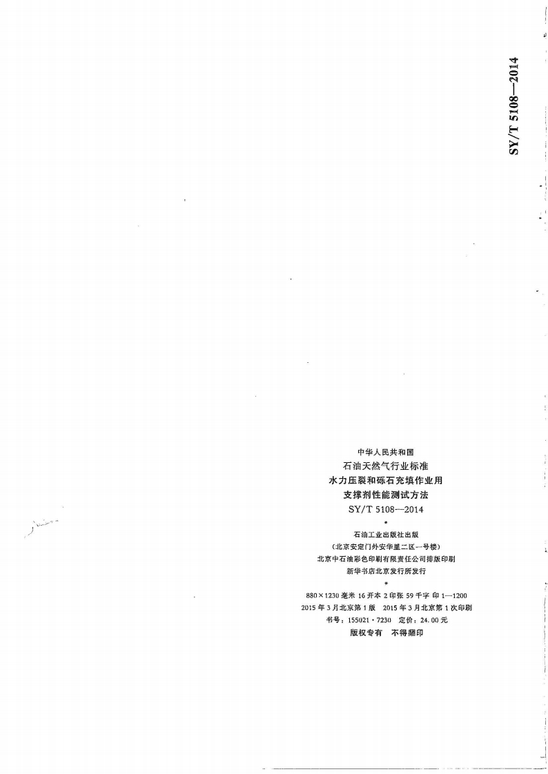 Cs75.020E14备案号:48158一2015SY中华人民共和国石油天然气行业标准SY/T5108一2014代替SY/T5108-2006,SY/T5184-2006水力压裂和砾石充填作业用支撑剂性能测试方法Measurement of properties of proppantsused in hydraulic fracturing and gravel-packing operations2014-10-15发布2015一03一01实施国家能源局发布
