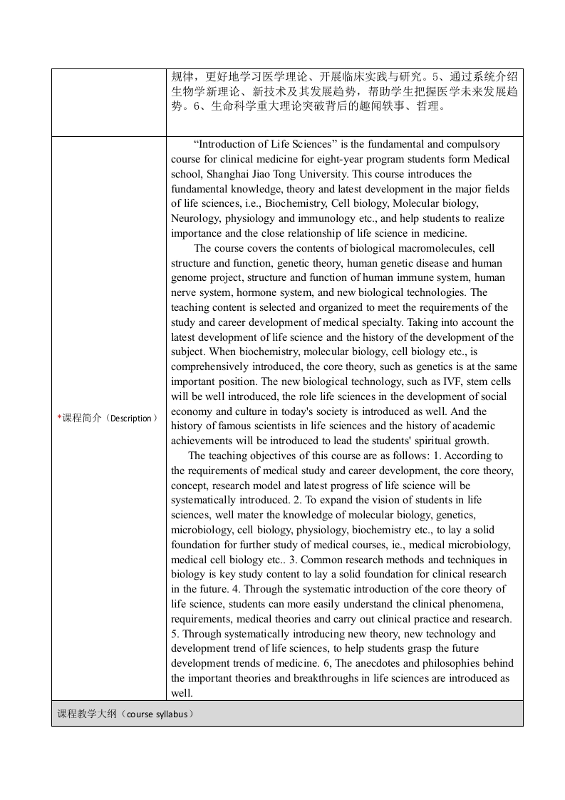 《生命科学导论》课程教学大纲课程基本信息(Course Information)课程代码*学时*学分BI001322(Course Code)(Credit Hours)Credits)*课程名称(中文)生命科学导论Course Name(英文)Introduction of Life Science课程性质专业基础课(Fundamental and compulsory course)(Course Type)授课对象(Audience)医学院临床八年(clinical medicine for eight--year program students)授课语言中文(Bilingual(Language of Instruction)*开课院系(School)生命学院(School of Life Sciences and Biotechnology)先修课程无(NonePrerequisite)授课教师课程网址马伟(Instructor(Course Webpage)本课程作为医学院核心基础课程,通过向医学院临床八年制专业本科生系统介绍生命科学中的生物化学、细胞生物学、分子生物学、神经、生理、免疫等各主要领域的基础知识、理论与最新的发展,培养学生的生命科学素养,帮助学生了解生命科学与医学的密切联系。课程内容涵盖生物大分子、细胞结构与功能、遗传理论与规律、人类遗传疾病与人类基因组计划、人体免疫系统机构与功能、人体神经、激素系统、新兴生物技术护等内容。教学内容组织时,紧密结合医学专业学习与发展的要求,兼顾生命科学的最新发展与学科发展历史:重点学习生物化学、分子生物学、细胞生物学等学科的同时,兼顾遗传等重要生命科学基础理论:既详细介绍以基因工程、人工辅助*课程简介(Description)生殖、干细胞等新兴生物技术技术以及在当今社会经济文化发展中的作用,又通过介绍生命科学著名学者的成长历程、学术成果取得历程等等事例,引领学生的精神成长。本课程的教学目标是:1、结合医学专业学习与发展要求,系统学习生命科学核心理论、概念、研究理念、模式与前沿进展。2、拓展学生生命科学视野的同时,为学生深入学习医学遗传学、生理学、生物化学、医学分子生物学、医学微生物学、医学细胞生物等医学专业课程打扎实基础。3、使学生了解、掌握生物学常用的研究方法、技术,为今后开展临床研究打下扎实基础。4、通过系统介绍生命科学核心理论,有助于学生更科学地、全面地理解临床现象、要求、医学理论与