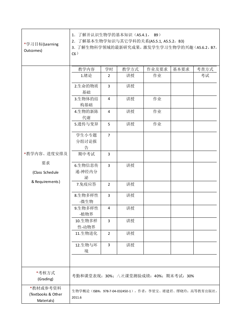 生物学概论课程教学大纲课程基本信息(Course Information)*课程代码*学时*学分BI0033(Course Code)48(Credit Hours)Credits)*课程名称(中文)生物学概论Course Name(英文)General Biology课程性质培养计划课程(Course Type)授课对象医学院口腔医学五年制(Audience)授课语言(Language of Instruction)中文*开课院系生命科学技术学院(School)先修课程无(Prerequisite)授课教师何亚文课程网址(Instructor)(Course Webpage)本课程是针对口腔医学五年制学生开设的课程,课程的内容主要集中在4个方面即细胞、遗传、生态和进化,具体包括:生物体的元素和分子组成、生物体的细胞结构基础、细胞呼吸和光合作用、遗传与变异、生物信息传递、免疫应答、*课程简介(Description)生物多样性、生物与环境以及生命的起源与进化等。通过该课程的学习,使学生能系统了解生命科学的概况,了解生命科学领域最新进展,掌握生物学学习、研究的一些方法,为后续专业课程的学习奠定一定的生物学知识基础。This course is designed to teach four main topics:cells,genetics,ecology andevolution.This course will cover the following separate units:essential chemistry forbiology and the molecules of life,a tour of the cell,cellular respiration andphotosynthesis,molecular biology of the gene,biological communication,biological*课程简介(Description)diversity,biology and environments,the origin and the evolution of life.The aim of this course is to:(1)intellectually enrich students with the basicconcept of general biology and to inspire them towards pursuing research;(2)toincrease the students'understanding of the basic methods for biological research;(3)to know the latest findings in biology.课程教学大纲(course syllabus)