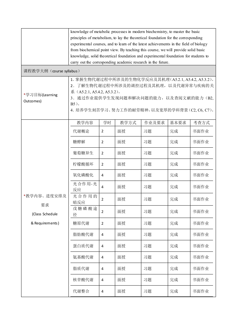 高级生物化学课程教学大纲课程基本信息(Course Information)*课程代码*学时*学分B1453(Course Code)48(Credit Hours)(Credits)*课程名称(中文)高级生物化学Course Name(英文)Advanced Biochemistry课程性质培养计划内课程(Course Type)授课对象生命科学相关专业本科生(Audience)授课语言双语(Language of Instruction)*开课院系生命科学技术学院(School)《高等数学》、《大学物理》、《分析化学》、《物理化学》、《有机化学》、《普通生物先修课程学》《生物化学》(Prerequisite)《Advanced Mathematics.》、《General Physics》、《Analytical Chemistry》、《PhysicalChemistry》、《Organic Chemistry》、《General Biology》《Biochemistry》授课教师课程网址林双君无Instructor(Course Webpage)《高级生物化学》课程是在《生物化学》课程基础上为生物类专业学生开设的门核心基础课。主要讲授生物代谢过程,包括糖代谢、光合作用、蛋白质代谢、脂代谢、氨基酸代谢等,这些代谢过程所涉及的途径、生物化学反应、催化这些生物化学反应的酶的特点及催化反应的机理、代谢途径的调控及其调控机制、代*课程简介(Description)谢异常与某些疾病发生的关系、以及某些药物如何在调节代谢过程中发挥作用而起到治疗的效果。目标是向生物类专业学生传授现代生物化学中代谢过程的专业基础知识,使他们掌握生物代谢过程中的基本原理,为相应的实验课程开展打下理论基础,同时能够从生物化学角度理解代谢及相关的生物学领域的最新成就,为将来开展相应的学术研究掌握扎实的基础知识、坚实的理论基础和实验基础。The course of Advanced Biochemistry is a core and foundation course for theundergraduate students in biology field in the base of the course of BiochemistryMetabolic processes are mainly taught,including sugar metabolism,photosynthesis,protein metabolism,lipid metabolism,amino acid metabolism,etc..as well as the*课程简介(Description)pathways involved in these metabolic processes,biochemical reactions,thecharacteristics of enzymes that catalyze these biochemical reactions,and themechanism of catalytic reactions,the regulation of metabolic pathways and theirregulatory mechanisms,the relationship between metabolic abnormalities and theoccurrence of certain diseases,and how certain drugs play a role in regulatingmetabolic processes and play a therapeutic role.The goal is to teach students the basic