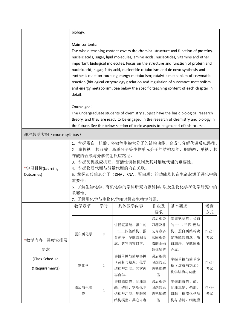 生物化学F类课程教学大纲课程基本信息(Course Information)课程代码*学时*学分B121048(Course Code)(Credit Hours)(Credits)*课程名称(中文)生物化学Course Title(英文)Biochemistry*课程性质本科生专业基础课(Course Type)授课对象化工学院三年级本科生(Target Audience*授课语言中文(Language of Instruction)*开课院系生命科学技术学院(School)先修课程无机化学,有机化学Prerequisite授课教师刘喜朋课程网址(Instructor(Course Webpage)课程性质:本课程基于化学原理,对照传统无机与有机化学反应,解释生命体中发生的各种化学反应的基本特征、对生命体维持其活性的重要性,从化学角度认识生命起源与进化,并利用生物化学知识解释体外的化学反应,为(体外)合成生物学的发展奠定生物化学基础。主要教学内容:*课程简介(Description)整个教学内容涵盖蛋白质、核酸、糖、脂质分子、氨基酸、核苷酸、维生素等重要生物分子的化学结构与功能。重点讲授蛋白与核酸的结构功能:糖、脂肪酸、核苷酸的分解代谢与从头合成以及合成反应偶联的能量代谢:各类酶促反应的催化机理(生物酶学):物质代谢与能量代谢的内在关联与调控。详见各章教学大纲的具体教学内容。课程教学目标:使化学学科的本科生具备基本的生物学研究理论:为其将来从事化学与生物学的交叉学科研究做好理论准备。Course nature:This course is based on the principle of chemical control,traditional inorganic andorganic chemical reactions,basic features,interpretation of various chemical*课程简介(Description)reactions occurring in living the importance of maintaining the activity of the body oflife,understanding of the origin and evolution of life from the chemical point,and theuse of chemical and biological knowledge to explain the chemical reaction in vitro,tolay the foundation of Biological Chemistry(in vitro)the development of synthetic