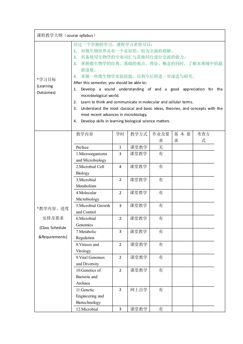 微生物学(D类)课程教学大纲课程基本信息(Course Information)课程代码学时学分B121148Course Code)(Credit Hours)(Credits)课程名称微生物学(D类)(Course Name)Microbiology (D)课程性质培养计划内课程(Course Type)授课对象(Target生物学、生物工程类及相关专业本科生Audience授课语言(Language of双语Instruction)开课院系生命科学技术学院(School)先修课程(Prerequisite)无授课教师陈峰、赵立平课程网址http://www.cnmooc.org(Teacher)(Course Webpage)本课程向生物学各专业学生传授微生物学的基本概念、知识及有关实验技能,是生物类专业本科生的必修专业基础课程。经过学习,课程学习者将对微生物世界具有一个良好的、较为全面的理解,这些生物学专业的学习者将具备使用生物学*课程简介的专业词汇与其他同行进行交流的能力。微生物学是生命科学领域中一个十分活(Description)跃的分支科学,所以,本课程在教学过程中,将在教授微生物学的经典、基础的观点、理论、概念的同时,向学习者介绍本领域中的一些最新的进展。微生物学也是一门以实验为基础的科学,所以本课程在教学当中也会向学习者传授一些实验技能,以利学习者在今后的进一步深造与研究。The objective of this course is to teach the basic concepts and experimental skills inmicrobiology to biology-related major students.Students should be able to develop asound understanding of and a good appreciation for the microbiological world.Ibelieve that the whole training for a biology-related major student is all about how tohelp him learn to think and communicate in molecular and cellular terms.*课程简介(Description)Microorganisms are the most diversified and interesting to study.Microbiology is oneof the most active and promising field in life sciences.I will try to integrate the mostclassical and basic ideas,theories,and concepts with the most recent advances inmicrobiology,which are so exciting and full of fun to know about.This course will betaught in English.I will do my best to help you develop skills in learning biologicalscience matters.Thus,learning to learn is another objective of this course.