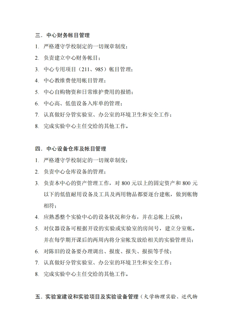 物理实验中心实验室技术人员岗位职责一,教务、资料及日常管理1.严格遵守学校制定的一切规章制度:2.协助中心教学副主任处理日常的教务工作:3.负责每学期课表、实验名称打印和张贴:4.负责每天所有实验课学生名单的打印并发放至总值班教师:5.负责处理学生选课中诸如取消选课、忘记密码等一系列问题,并起到学生与任课教师的桥梁作用:6.负责实验教材及实验报告纸的发售工作:7.负责中心资料(教学、设备、管理等材料)和文办用品的管理、复印机管理和文印、收发工作:8.负责学生和教师实验报告箱的管理工作;9.认真做好分管实验室、办公室的环境卫生和安全工作:10.完成实验中心主任交给的其他工作。二.机房、网站及中心计算机维护管理1.严格遵守学校制定的一切规章制度;2.负责机房日常管理与维护,确保机房的正常运作:3.负责中心网站的管理、维护和信息的发布,并根据中心发展的需求,逐渐健全中心网站的内容:4.负责整个中心所有在用计算机软、硬件的技术维护和网络的管理:5.认真做好分管实验室、办公室的环境卫生和安全工作:6.完成实验中心主任交给的其他工作。
