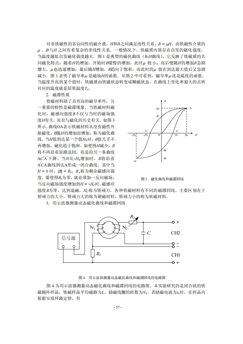 实验十一磁性材料基本特性的研究磁性材料在电力、通讯、电子仪器、汽车、计算机和信息存储等领域有着十分广泛的应用.磁滞回线和居里温度是表征磁性材料的两个基本特性.磁滞回线反映磁性材料在外磁场中的磁化特性,而居里温度则是磁性材料由铁磁性转变为顺磁性的相变温度,本实验通过对软磁铁氧体材料居里温度及动态磁滞回线的测量,加深对这一磁性材料基本特性的理解。【实验目的】1.了解磁性材料的磁滞回线和磁化曲线概念,加深对铁磁材料的主要物理量矫顽磁力、剩磁和磁导率的理解:2.利用示波器观察并测量磁化曲线与磁滞回线:3.测定所给定的铁磁材料的居里温度.【实验原理】1.磁化性质一切可被磁化的物质叫作磁介质.磁介质的磁化规律可用磁感应强度B、磁化强度M、磁场强度H来描述,它们满足以下关系B=4(H+M)=(Xm+14H=4,4H=H(1)式中,=4π10H/m为真空磁导率,m为磁化率,4,=Xm+1=BμH为相对磁导率,是一个无量纲的系数.4=4为绝对磁导率.对于顺磁性介质,磁化率xm>0,4,略大于1:对于抗磁性介质,Xm<0,一般xm的绝对值在10~10之间,4,略小于1:而铁磁性介质的Xm>1,所以,4r>1.B◆IB-Hu-H图1磁化曲线和山~H曲线图24~T曲线-56.