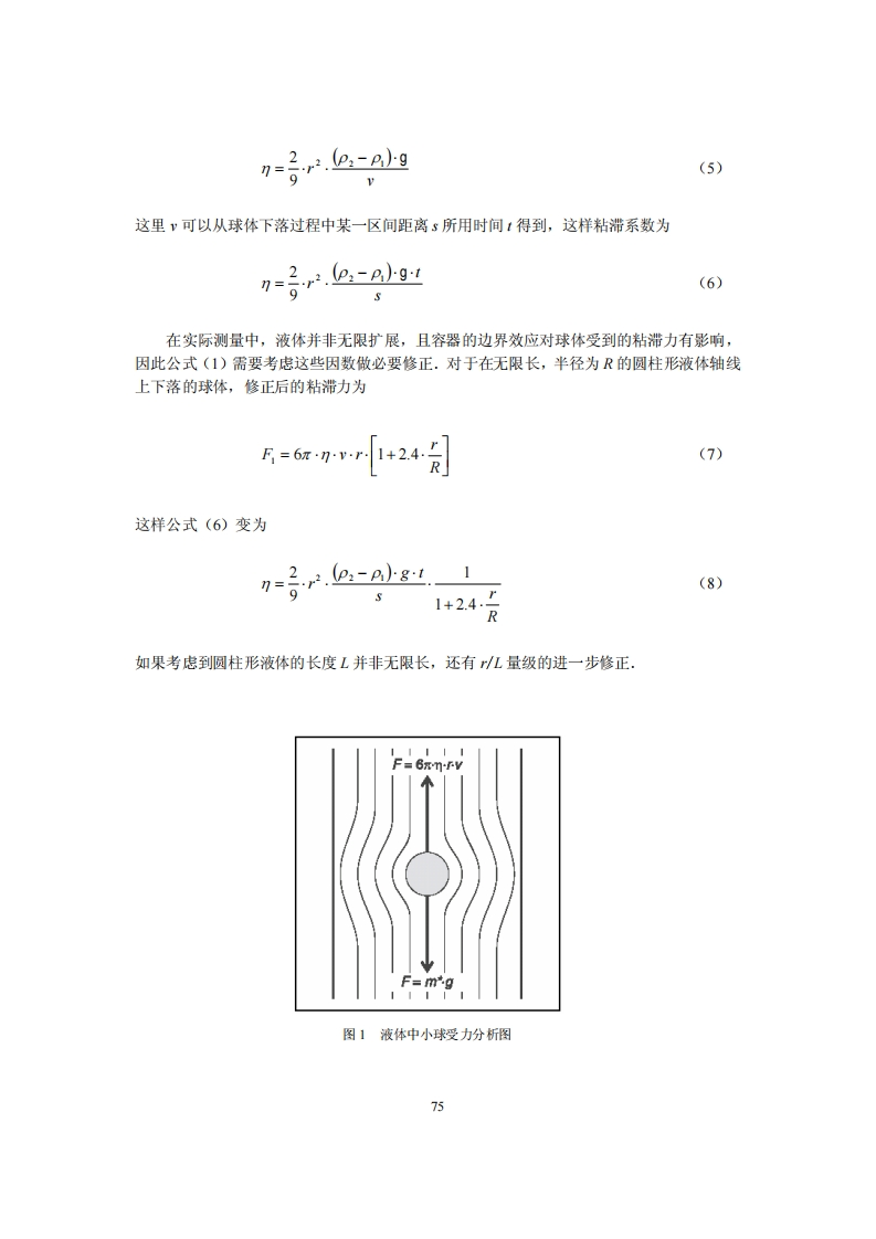 实验十一落球法测液体的粘滞系数粘滞系数是液体的重要性质之一,它反映液体流动行为的特征.粘滞系数与液体的性质,温度和流速有关,准确测量这个量在工程技术方面有着广泛的实用价值.如机械的润滑,石油在管道中的传输,油脂涂料,医疗和药物等方面,都需测定粘滞系数.测量液体粘滞系数方法有多种,落球法(又称Stokes法)是最基本的一种,它可用于测量粘度较大的透明或半透明液体,如蓖麻油,变压器油,甘油等.【实验目的】1.学习和掌握一些基本物理量的测量:2.学会落球法测定液体的粘滞系数.【实验原理】一个在液体中运动的物体会受到一个与其速度反方向的摩擦力,这个力的大小与物体的几何形状、物体的速度以及液体的内摩擦力有关.液体的内摩擦力可用粘滞系数来表征.对于一个在无限扩展液体中以速度v运动的半径为r的球形物体,斯托克斯(GG.Stokes)推导出该球形物体受到的摩擦力即粘滞力为F=6π…nv…r(1)当一个球形物体在液体中垂直下落时,它要受到三种力的作用,即向上的粘滞力F、向上的液体浮力F2和向下的重力F3.球体受到液体的浮力可表示为.r3.pg(2)3上式中ρ1为液体的密度,g为重力加速度.球体受到的重力为5=42pg(3)3式中ρ2为球体的密度.当球体运动某一时间后,上述三种力将达到平衡,即F+F=F(4)此时,球体将以匀速ⅴ运动(v也称为收尾速度).因此,可以通过测量球体的下落速度'来确定液体的粘滞系数:多