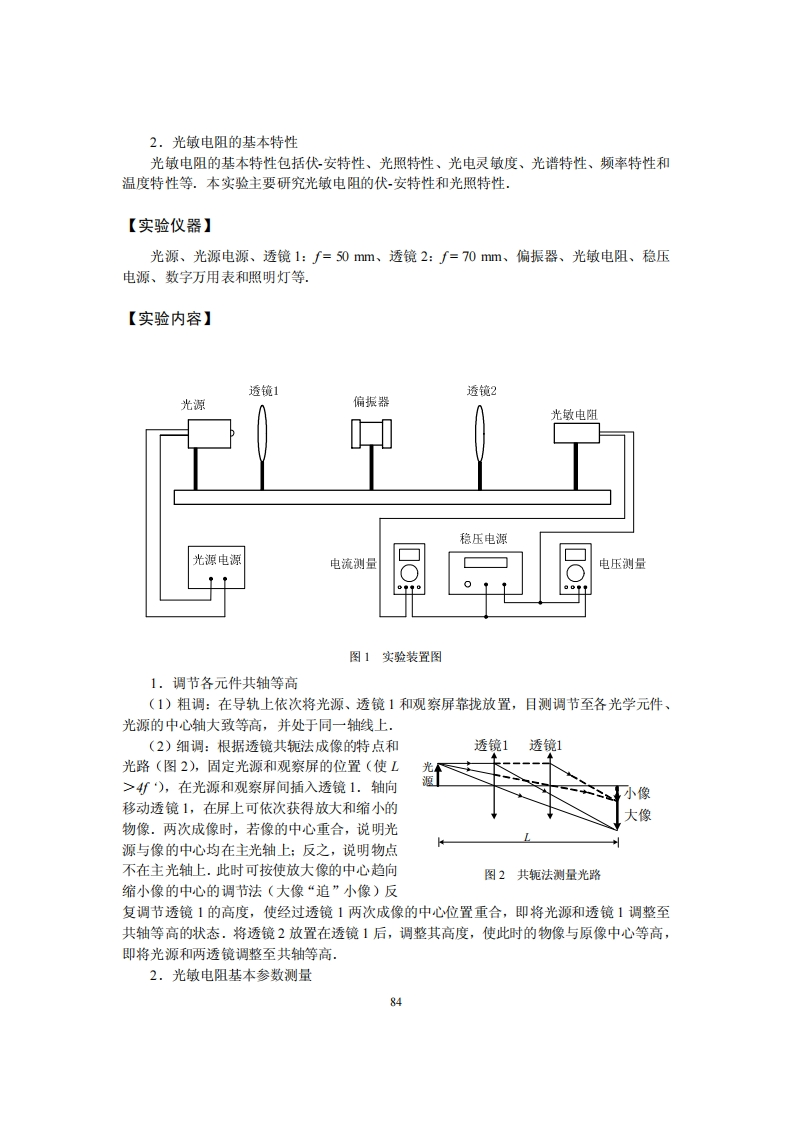 实验十三光敏电阻基本特性的测量光电传感器是一种将光量的变化转换为电量变化的传感器.它的物理基础就是光电效应.光电效应分为外光电效应和内光电效应两大类.【实验目的】1.了解简单光路的调整原则和方法:2.在一定照度下,测量光敏电阻的电压与光电流的关系:3.在一定电压下,测量光敏电阻的照度与光电流的关系【实验原理】1.光敏电阻的工作原理在光照作用下能使物体的电导率改变的现象称为内光电效应.本实验所用的光敏电阻就是基于内光电效应的光电元件.当内光电效应发生时,固体材料吸收的能量使部分价带电子迁移到导带,同时在价带中留下空穴.这样由于材料中载流子个数增加,使材料的电导率增加,电导率的改变量为△o=△pe4。+△ne4n(1)(1)式中e为电荷电量:△p为空穴浓度的改变量:△n为电子浓度的改变量:4。为空穴的迁移率:4m为电子的迁移率.当光敏电阻两端加上电压U后,光电流为·△oU(2)d其中A为与电流垂直的截面积,d为电极间的距离.用于制造光敏电阻的材料主要有金属的硫化物、硒化物和锑化物等半导体材料.目前生产的光敏电阻主要是硫化镉。光敏电阻具有灵敏度高、光谱特性好、使用寿命长、稳定性能高、体积小以及制造工艺简单等特点,被广泛地用于自动化技术中。本实验光敏电阻得到的光照Φ由一对偏振片来控制.当两偏振片之间的夹角为α时,光照中D为①=ΦDcos2a(3)其中:Φ为不加偏振片时的光照,D为当两偏振片平行时的透明度,83