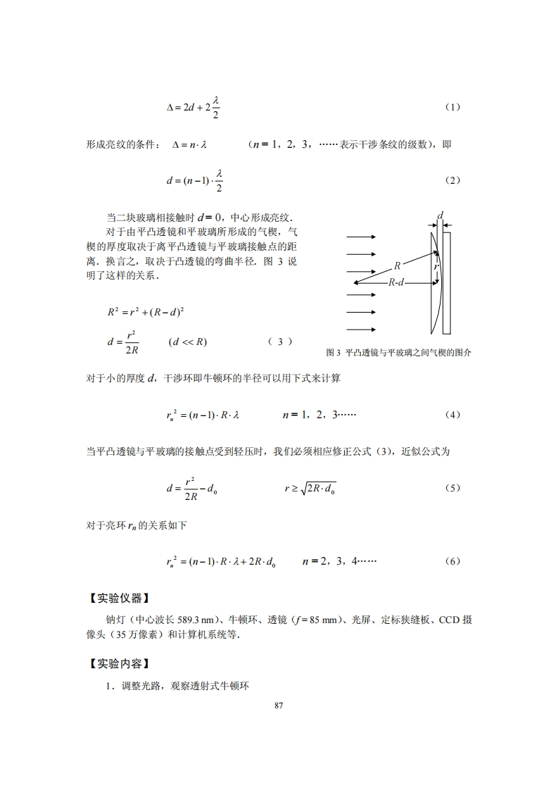 实验十四用CCD成像系统观测牛顿环“牛顿环”是一种分振幅等厚干涉现象,是光的波动性的一种表现.“牛顿环”在光学加工中有广泛的应用,例如,利用它可精确地检验光学元件表面的质量,并测试压力与形变的关系等CCD(Charge-Coupled Device,电荷耦合器件)在图象传感和非接触测量领域发展迅速.用CCD观测牛顿环,具有直观,精确度高,图象可保存等优点。【实验目的】1.在进一步熟悉光路调整的基础上,用透射光观察等厚干涉现象一牛顿环:2.学习利用干涉现象测量平凸透镜的曲率半径.【实验原理】牛顿环仪是由一块曲率半径较大的平凸透镜放在光学平玻璃上构成,平玻璃表面与凸透镜球面之间形成一楔形的空气间隙.当用平行光照射牛顿环仪时,在球面与平玻璃接触点周围就形成了同心圆干涉环一牛顿环.我们可以用透射光来观察这些干涉环,由于空气隙的边界表面是弯曲的,干涉环之间的间距是不等的.图1透射式牛顿环原理图在图2中,一束光L从左面照在距离为d的空气楔处.部分光T,在气楔的左面边界反射回去.部分光T2通过气楔.在气楔的右面边界A有部分光T3反射回来,由于此处是从折射率大的平玻璃面反射,所以包含一个相位变化.部AA分光T4先从气楔右边界反射回来,然后又从气楔的左面边界反射回来,每一次反射均有一个MAA相位变化(即半波损失).图2表示两束光T2AARA和T4形成透射干涉的原理.T2和T4的光程差△为图2光通过空气楔干涉的图介86