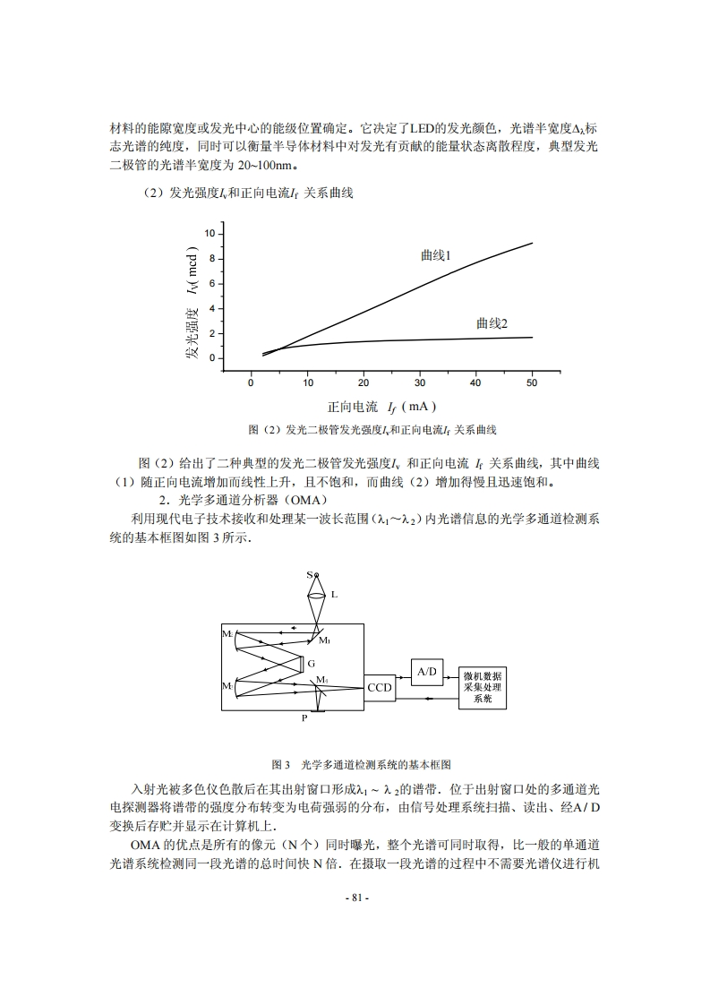 实验十五用光学多通道分析器研究发光二极管光谱光谱分析是研究物质微观结构的重要方法,它广泛应用于化学分析、医药、生物、地质、冶金和考古等部门.常见的光谱有吸收光谱、发射光谱和散射光谱.涉及的波段从x射线、紫外光、可见光、红外光到微波和射频波段.本实验通过测量发光二极管的发射光谱,使大家了解发光二极管的主要光学特性和光谱测量的基本方法.【实验目的】1.了解发光二极管发射光谱:2.测量发光二极管相对输出光强和正向电流I关系:3.掌握多通道分析器的原理和使用方法.【实验原理】1.发光二极管的光学特性半导体发光二极管与普通二极管和双极晶体管一样,具有低工作电压和低阻抗特点,是一种电流型器件。发光二极管体积小、重量轻、寿命长、结构牢固、工作可靠,已得到广泛应用。发光二极管根据芯片发光波长可以分成红色、橙色、绿色、兰色和多色等数种类型。发光二极管主要光学性质有(1)发射光谱曲线10080架60闵206006206406606070072074076078000820波长(nm)图(1)发光二极管发射光谱曲线图(1)给出了典型发光二极管发射光谱曲线。发光二极管发光峰值波长无由半导体-80-