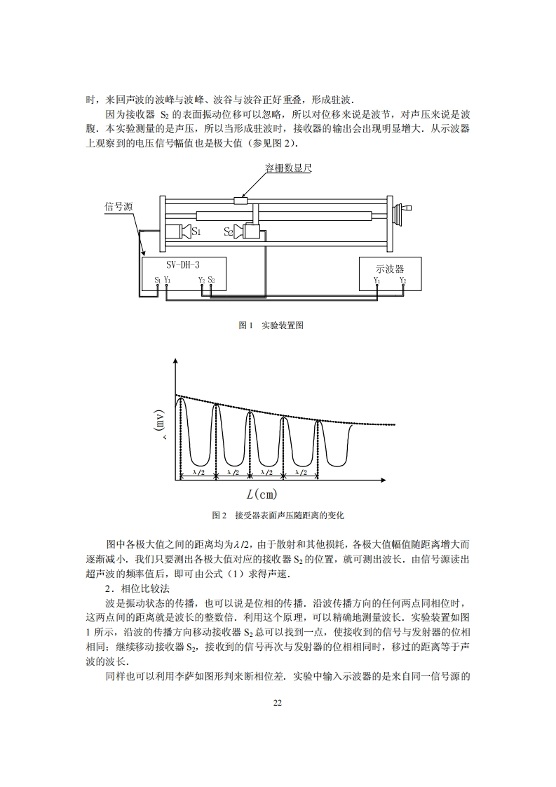 实验一声速的测量声波是在弹性媒质中传播的一种机械波,由于其振动方向与传播方向一致,故声波是纵波.振动频率在20Hz~20kHz的声波可以被人们听到,称为可闻声波:频率超过20KHz的声波称为超声波。对于声波特性的测量(如频率、波速、波长、声压衰减和相位等)是声学应用技术中的一个重要内容,特别是声波波速(简称声速)的测量,在声波定位、探伤、测距等应用中具有重要的意义,【实验目的】1.学会用共振干涉法、相位比较法以及时差法测量介质中的声速:2.学会用逐差法进行数据处理:3.了解声速与介质参数的关系【实验原理】由于超声波具有波长短,易于定向发射、易被反射等优点.在超声波段进行声速测量的优点还在于超声波的波长短,可以在短距离较精确地测出声速.超声波的发射和接收一般通过电磁振动与机械振动的相互转换来实现,最常见的方法是利用压电效应和磁致伸缩效应来实现的.本实验采用的是压电陶瓷制成的换能器(探头),这种压电陶瓷可以在机械振动与交流电压之间双向换能。声波的传播速度与其频率和波长的关系为v=元f(1)由(1)式可知,测得声波的频率和波长,就可得到声速.同样,传播速度亦可用v=L/t(2)表示,若测得声波传播所经过的距离L和传播时间七,也可获得声速,1.共振干涉法实验装置如图1所示,图中S1和S2为压电晶体换能器,S1作为声波源,它被低频信号发生器输出的交流电信号激励后,由于逆压电效应发生受迫振动,并向空气中定向发出一近似的平面声波:S2为超声波接收器,声波传至它的接收面上时,再被反射.当S1和S2的表面互相平行时,声波就在两个平面间来回反射,当两个平面间距L为半波长的整倍数,即L=nn=0,1,2,…(3)21