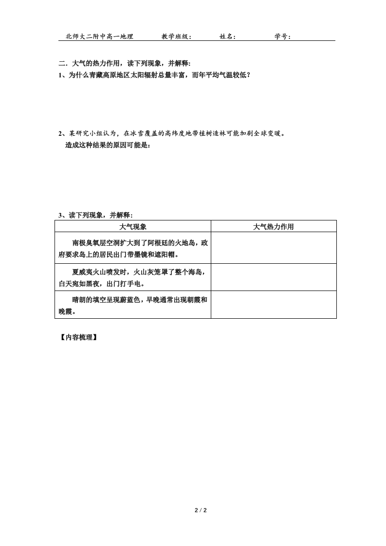 2.2.1大气受热过程(1)348072@abc20天前发布关注私信56.29KB2页0252.2.1大气受热过程(1)此内容为付费资源,请付费后查看¥19¥23黄金会员免费钻石会员免费立即购买您当前未登录!建议登陆后购买,可保存购买订单付费资源 第1页 / 共2页 第2页 / 共2页 已完成全部阅读,共2页 THE ENDPPT模板安卓开发实习实践小程序设计工学类毕业设计理学类管理学类 文本预览 北师大二附中高一地理教学班级:姓名:学号:2.2.1大气受热过程一、大气的受热过程1、大气的削弱作用参与作用的大气成分波长范围作用特征2、大气的保温作用3、绘制大气受热过程示意图大气上界y下垫面4、小结:大气热量的根本来源:近地面大气热量的直接来源:是长波辐射的是1/2 查看更多 收起部分 喜欢就支持一下吧收藏