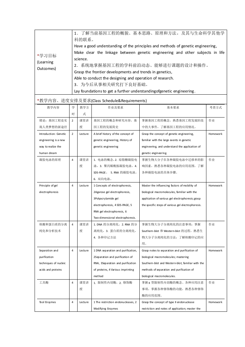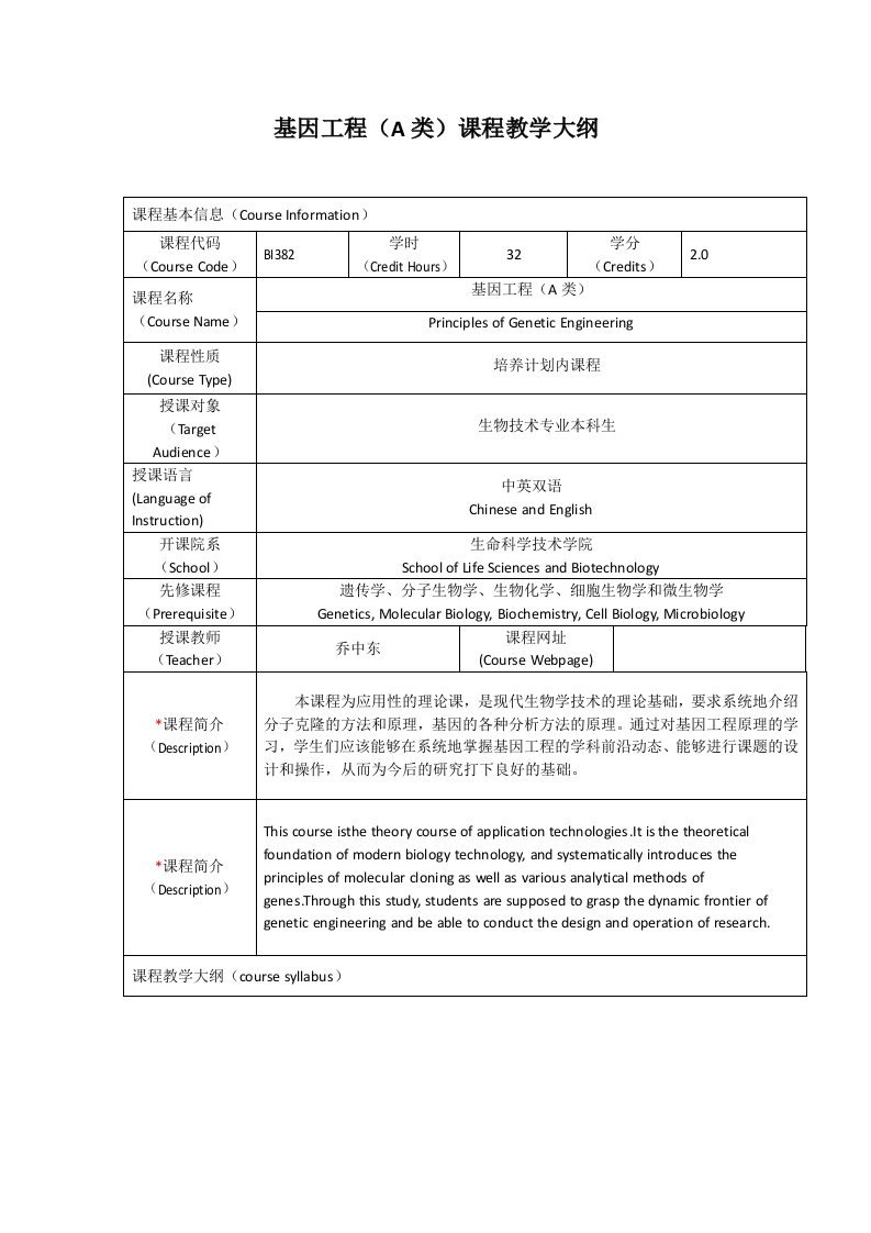 基因工程(A类)课程教学大纲课程基本信息(Course Information)课程代码学时B138232学分2.0Course Code)(Credit Hours)Credits)课程名称基因工程(A类)(Course Name)Principles of Genetic Engineering课程性质培养计划内课程(Course Type)授课对象(Target生物技术专业本科生Audience)授课语言中英双语(Language ofChinese and EnglishInstruction)开课院系生命科学技术学院(School)School of Life Sciences and Biotechnology先修课程遗传学、分子生物学、生物化学、细胞生物学和微生物学(Prerequisite)Genetics,Molecular Biology,Biochemistry,Cell Biology,Microbiology授课教师乔中东课程网址(Teacher)(Course Webpage)本课程为应用性的理论课,是现代生物学技术的理论基础,要求系统地介绍*课程简介分子克隆的方法和原理,基因的各种分析方法的原理。通过对基因工程原理的学(Description)习,学生们应该能够在系统地掌握基因工程的学科前沿动态、能够进行课题的设计和操作,从而为今后的研究打下良好的基础。This course isthe theory course of application technologies.It is the theoretical*课程简介foundation of modern biology technology,and systematically introduces theprinciples of molecular cloning as well as various analytical methods of(Description)genes.Through this study,students are supposed to grasp the dynamic frontier ofgenetic engineering and be able to conduct the design and operation of research.课程教学大纲(course syllabus)
