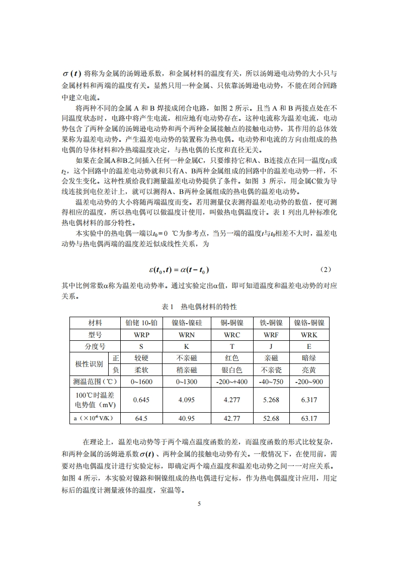 实验二热电偶温度计定标【实验目的】1.掌握对热电偶温度计定标的方法:2.掌握非电量电测方法的基本原理。【实验仪器】保温杯,烧杯,电热杯,温度计,镍-铜镍热电偶,PZ114A型直流数字电压表,79HW1恒温磁力搅拌器(半导体温度计),见图1。【实验原理】非电量电测方法是利用传感器把温度、压力、光强等非电信号转换成电信号,通过测量电压、电流等电信号来获得这些非电学量的方法。本实验中的热电偶温度计就是把温度转换成电压来测量。当一个金属棒的两端分别为不同的温度1和2时,由于金属中电子的热运动,在棒的两端有一电动势存在,称为汤姆逊电动势。4,4)=fc0(1)79HW.1極煜磁力桅林器B电开美图2图1-----金属A接磁力搅拌需接数字电压表一一-金国B接数字码皮印金C平中导度时电1y热端冷端热冷图3图4