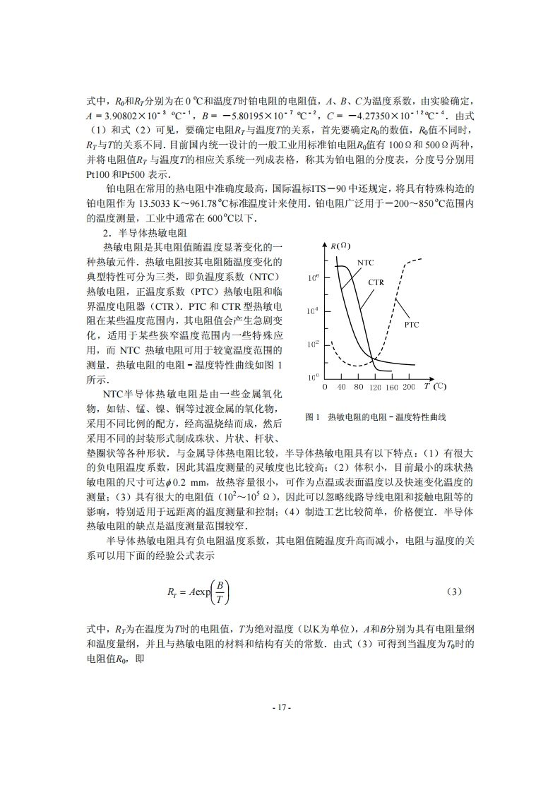 实验三温度传感器特性的研究温度传感器是检测温度的器件,被广泛用于工农业生产、科学研究和生活等领域,其种类多,发展快.温度传感器一般分为接触式和非接触式两大类.所谓接触式就是传感器直接与被测物体接触进行温度测量,这是温度测量的基本形式.而非接触式是测量物体热辐射而发出的红外线从而测量物体的温度,可进行遥测,这是接触方式所做不到的,接触式温度传感器有热电偶、热敏电阻以及铂电阻等,利用其产生的热电动势或电阻随温度变化的特性来测量物体的温度,被广泛用于家用电器、汽车、船舶、控制设备、工业测量、通信设备等.另外,还有一些新开发研制的传感器,例如,有利用半导体PN结电流/电压特性随温度变化的半导体集成传感器:有利用光纤传播特性随温度变化或半导体透光随温度变化的光纤传感器:有利用弹性表面波及振子的振荡频率随温度变化的传感器:有利用核四重共振的振荡频率随温度变化的NQR传感器:有利用在居里温度附近磁性急剧变化的磁性温度传感器以及利用液晶或涂料颜色随温度变化的传感器等,非接触方式是通过检测光传感器中红外线来测量物体的温度,有利用半导体吸收光而使电子迁移的量子型与吸收光而引起温度变化的热型传感器.非接触传感器广泛用于接触温度传感器、辐射温度计、报警装置、来客告知器、火灾报警器、自动门、气体分析仪、分光光度计、资源探测等。本实验将通过测量几种常用的接触式温度传感器的特征物理量随温度的变化,来了解这些温度传感器的工作原理.【实验目的】1.了解几种常用的接触式温度传感器的原理及其应用范围:2.测量这些温度传感器的特征物理量随温度的变化曲线.【实验原理】1.铂电阻导体的电阻值随温度变化而改变,通过测量其电阻值推算出被测环境的温度,利用此原理构成的传感器就是热电阻温度传感器.能够用于制作热电阻的金属材料必须具备以下特性:(1)电阻温度系数要尽可能大和稳定,电阻值与温度之间应具有良好的线性关系:(2)电阻率高,热容量小,反应速度快:(3)材料的复现性和工艺性好,价格低:(4)在测量范围内物理和化学性质稳定.目前,在工业中应用最广的材料是铂和铜铂电阻与温度之间的关系,在0~630.74℃范围内可用下式表示R=R(1+AT+BT2)(1)在一200~0℃的温度范围内为R =Ro1+AT+BT2+C(T-100C)T(2)-16-