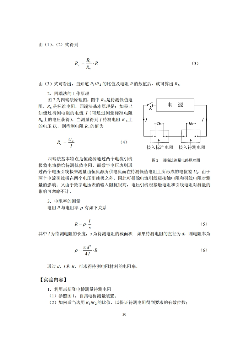 实验三直流电桥与电阻测量电阻的阻值范围一般很大,可以分为三大类型进行测量.惠斯登电桥法(WheatstoneBridge Method)是测量中值电阻(10~l0Q)的常用方法之一.它通过在平衡条件下,将待测电阻与标准电阻进行比较以确定其数值。电桥法具有测试灵敏、精确和使用方便等特点,已被广泛地应用于电工技术和非电量电测法中.对于低值电阻(10Q以下),不能应用通常的惠斯登电桥测量,其主要矛盾是在接触处存在接触电阻(大小在102Q的数量级).当待测电阻值在10Q甚至102以下时,显然接触电阻和引线电阻将使测量完全失去其正确性.因此,对于低值电阻,须采用可消除接触电阻和引线电阻的测量方法一四端法(Four Probe Method)进行测量(也可采用开尔文电桥法进行测量).四端法是国际上通用的测量低值电阻的标准方法之一,它是通过测量待测电阻两端电压和流经的电流来确定其数值的.四端法具有直接,且克服触点电阻和引线电阻等特点,适用于各类电阻的测量,尤其是低值电阻的测量.而对于高值电阻(>10'Q)的测量,一般可用兆欧表和数字万用表.【实验目的】1.掌握惠斯登电桥测量电阻的原理和方法:2.掌握四端法测量电阻的原理和方法.【实验原理】1.惠斯登电桥的工作原理惠斯登电桥的原理如图1所示,它是由电阻R1、R2、R和待测电阻R以及用导线连成的封闭四边形ABCDA组成,在对角线AC两端接电源,在对角线BD两端接电压表V.接入电压表的对角线称为“桥”,4个电阻R1、R、R和R,就称为“桥臂”.在一般情况下,电压表上有电压显示.若适当调节R1、R2和R阻值,能使电压表的显示电压V恰好为零,这时叫做“电桥平衡”.A电桥平衡时(V=O),表明B、D两点的电势相等,由此得到UAB=UAD,UBC=UDC,E亦即I1R1=12R2,IxR x=IRR(1)图1惠斯登电桥原理图同时有I1=Ix,12=IR(2)39