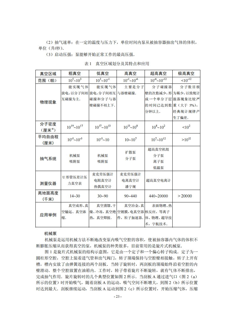 实验四真空获得与真空镀膜压强低于一个标准大气压的稀薄气体空间称为真空.在真空状态下,由于气体稀薄,分子之间或分子与其它质点之间的碰撞次数减少,分子在一定时间内碰撞于固体表面上的次数亦相对减少,这导致其有一系列新的物化特性,诸如热传导与对流小,氧化作用少,气体污染小,汽化点低,高真空的绝缘性能好等等.真空技术是基本实验技术之一,真空技术在近代尖端科学技术,如表面科学、薄膜技术、空间科学、高能粒子加速器、微电子学、材料科学等工作中都占有关键的地位,在工业生产中也有日益广泛的应用.薄膜技术在现代科学技术和工业生产中有着广泛的应用.例如,光学系统中使用的各种反射膜、增透膜、滤光片、分束镜、偏振镜等:电子器件中用的薄膜电阻,特别是平面型晶体管和超大规模集成电路也有赖于薄膜技术来制造:硬质保护膜可使各种经常受磨损的器件表面硬化,大大增强表面耐磨程度:在塑料、陶瓷、石膏和玻璃等非金属材料表面镀以金属膜具有良好的美化装饰效果,有些合金膜还起着保护层的作用:磁性薄膜具有记忆功能,在电子计算机中用作存储记录介质而占有重要地位.薄膜制备的方法主要有真空蒸发、溅射、分子束外延、化学镀膜等.真空镀膜,是指在真空条件中采用蒸发和溅射等技术使镀膜材料气化,并在一定条件下使气化的原子或分子牢固地凝结在被镀的基片上形成薄膜.真空镀膜是目前用来制备薄膜最常用的方法,真空镀膜技术目前正在向各个重要的科学领域中延伸,引起了人们广泛的注意.【实验目的】1.了解真空技术的基本知识:2.掌握低、高真空的获得和测量的基本原理及方法:3.了解真空镀膜的基本知识:4.学习掌握蒸发镀膜的基本原理和方法!【实验原理】1.真空度与气体压强真空度是对气体稀薄程度的一种客观度量,单位体积中的气体分子数越少,表明真空度越高.由于气体分子密度不易度量,通常真空度用气体压强来表示,压强越低真空度越高.按照国际单位制(S),压强单位是牛顿/米2,称为帕斯卡,简称帕(Pa)通常按照气体空间的物理特性及真空技术应用特点,将真空划分为几个区域,见表1.2.真空的获得用来获得真空的设备称为真空泵,真空泵按其工作机理可分为排气型和吸气型两大类.排气型真空泵是利用内部的各种压缩机构,将被抽容器中的气体压缩到排气口,而将气体排出泵体之外,如机械泵、扩散泵和分子泵等.吸气型真空泵则是在封闭的真空系统中,利用各种表面(吸气剂)吸气的办法将被抽空间的气体分子长期吸着在吸气剂表面上,使被抽容器保持真空,如吸附泵、离子泵和低温泵等,真空泵的主要性能可有下列指标衡量:(1)极限真空度:无负载(无被抽容器)时泵入口处可达到的最低压强(最高真空度)..22-