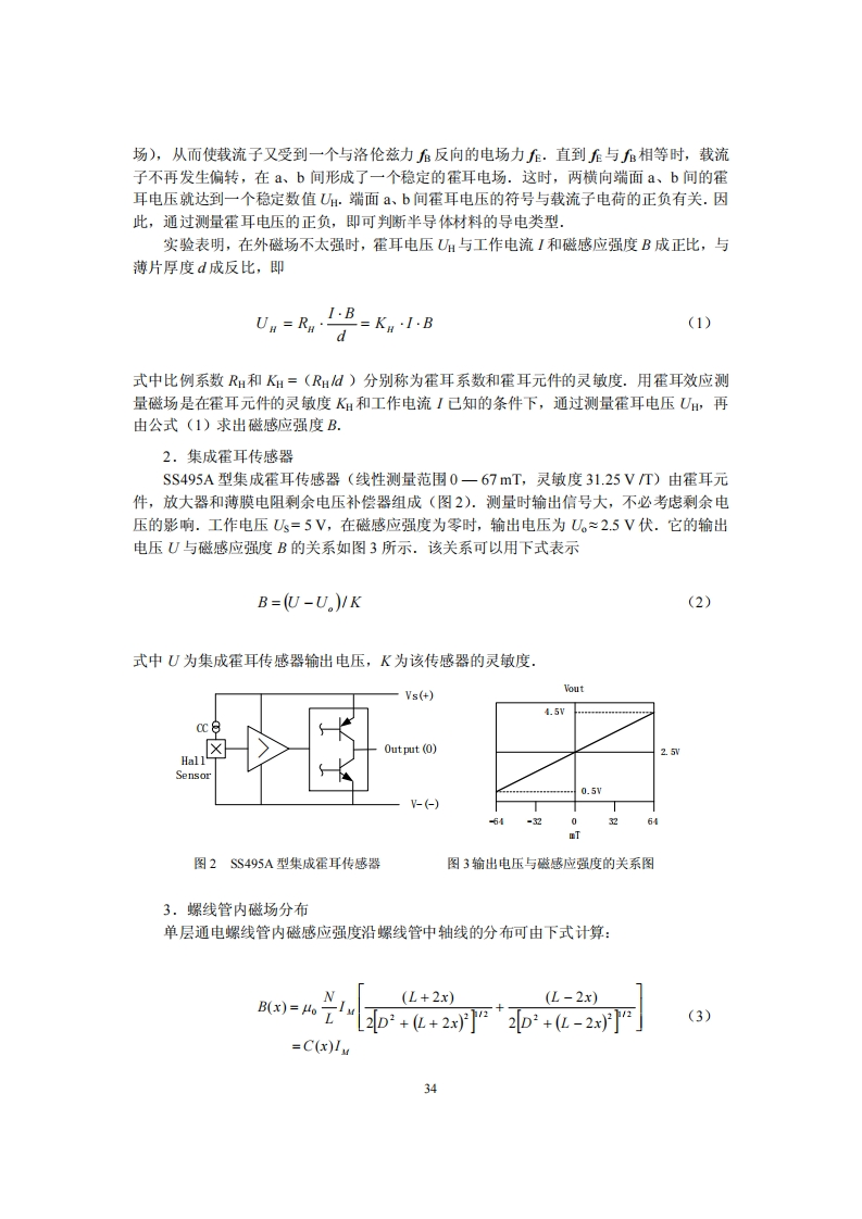 实验四集成霍耳传感器的特性测量与应用1879年,霍耳(EH.Ha川)在一个用来判新导体中载流子符号的实验中发现了一种电磁现象,即霍耳效应.后来人们发现半导体、导电流体等也有这种效应,而且半导体的霍耳效应比金属强很多.基于霍耳效应测定的霍耳系数,可用于确定半导体材料的导电类型、载流子浓度及迁移率等参数.导电流体中的霍耳效应也是目前正在研究中的“磁流体发电”的理论基础.近年来,霍耳效应实验不断有新发现.1980年,德国物理学家克利芩(K.VoKlitzing)在低温和强磁场下发现了量子霍耳效应,这是近年来凝聚态物理领域最重要的发现之一.克利芩也因这一重要发现而获得1985年的诺贝尔物理学奖.目前对量子霍耳效应仍在进行更深入的实验和理论研究,并已取得了重要应用.例如用于确定电阻的自然基准,可以极为精确地测定光谱精细结构常数.近三十多年以来,基于霍耳效应用具有高载流子迁移率的半导体材料制成的霍耳传感器的制造技术和应用得到了全面发展.新的制造技术,如集成电路技术和分子束外延技术的应用,使得霍耳传感器具有高的可靠性、高的灵敏度和良好的温度稳定性,而在汽车、电力电子技术、无刷直流电机、电能管理、遥控、遥测、计算机数据采集以及医疗仪器上形成了广泛的产业性应用.【实验目的】1.了解霍耳效应原理和集成霍耳传感器的工作原理:2.通过测量螺线管励磁电流与集成霍耳传感器输出电压的关系,证明霍耳电势差与磁感应强度成正比:3.用通电螺线管中心点处磁感应强度的理论计算值校准集成霍耳传感器的灵敏度:4.测量螺线管内磁感应强度沿螺线管中轴线的分布,并与相应的理论曲线比较.【实验原理】1.霍耳效应将一导电体(金属或半导体)薄片放在磁场中,并使薄片平面垂直于磁场方向(如图1所示).当薄片纵向端面有电流I流过时,在与电流I和磁场B垂直的薄片横向端面a、b间就会产生一电势差,这种现象称为霍耳效应(Hall effect),所产生的电势差叫做霍耳电势差或霍耳电压,用UH表示.霍耳效应是由运动电荷(载流子)在磁场中受到洛伦兹力的作用引起的.洛伦兹力使载流子发生偏转,在薄片横向端面上聚积电荷形成不断增大的横向电场EH(称霍耳电++千b++++++图1霍耳效应原理33