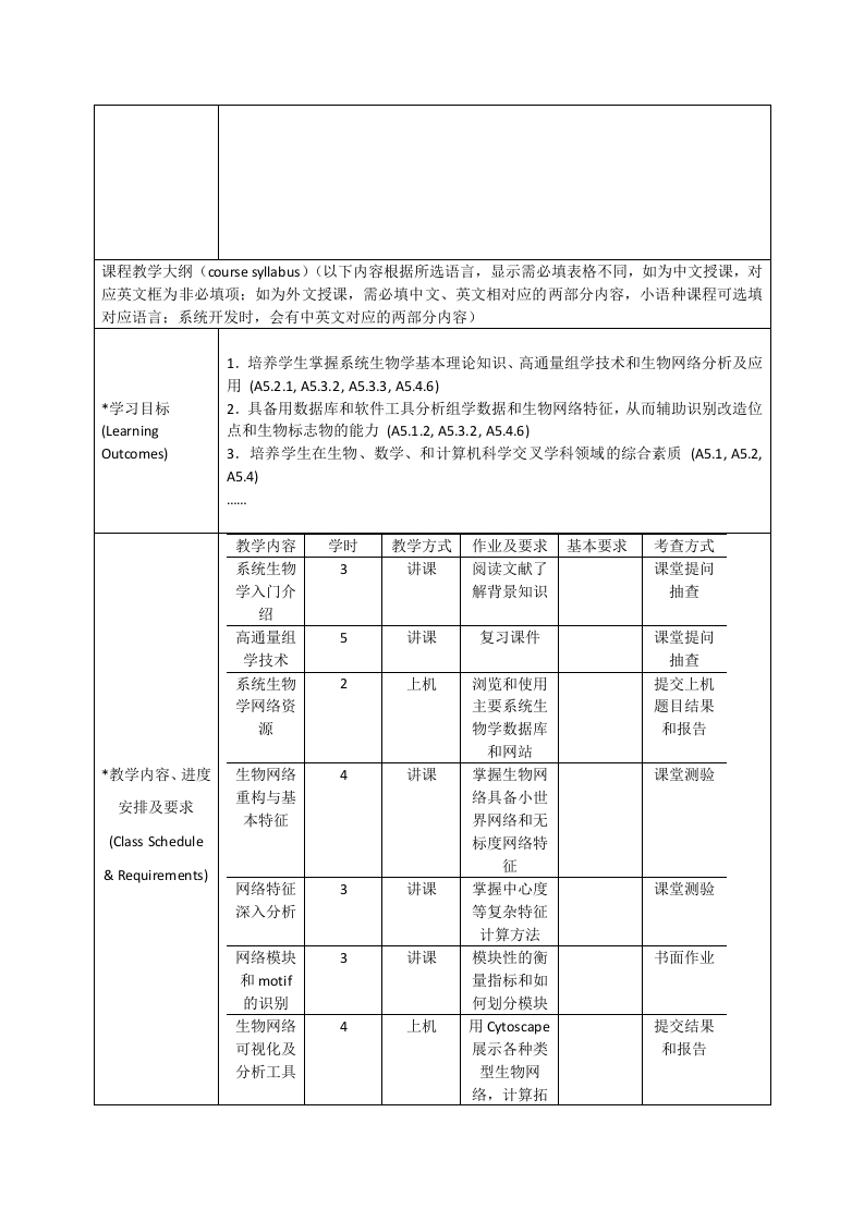 系统生物学课程教学大纲课程基本信息(Course Information)课程代码学时学分Bl470(Credit322(Course Code)(Credits)Hours)课程名称系统生物学(Course Name)Systems Biology课程性质培养计划内课程(Course Type)授课对象(Target生物信息学专业本科生Audience)授课语言(Language of中外双语Instruction)开课院系生命科学学院(School)先修课程生物信息学(Prerequisite)授课教师课程网址王卓(Coursehttp://cbb.sjtu.edu.cn/~zwang/sysbio/(TeacherWebpage)主要介绍系统生物学的发展过程、基本概念和研究内容,包括基因组学、转录组学、蛋白质组学、代谢组学等不同层次的概念和研究领域,生物网络拓扑结构分析与动态建模,代谢流模拟及在代谢工程与健康领域的应用等。培养学生对*课程简介前沿交叉科学的兴趣,了解系统生物学领域的进展和存在问题、掌握基本研究方(Description)法,具备用计算手段解决生物学问题的能力。并通过分组大作业,让2-3名同学合作完成一个利用生物网络解决问题的实例,提高学生的科研能力和团队合作精神。The history,theory,and main topics of systems biology will be introduced in thiscourse,including genomics,transcriptomics,proteomics,metabolomics,biologicalnetwork topology and modeling,and metabolic flux simulation.We will talk abouthow to apply these strategies to guide metabolic engineering and identify drug targets*课程简介and biomarkers for human health.By learning this course,the students will be(Description)】interested in the interdisciplinary filed,learn the development and challenge ofsystems biology,and be able to use computational methods to solve biologicalquestions.In addition,2-3 students will be asked to form a team and perform a casestudy on biological network modeling,so that their research skills and teamworkabilities can be improved.