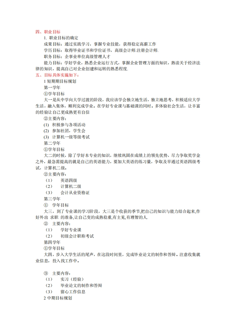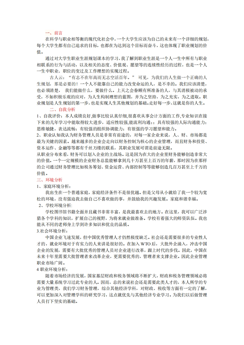 一、前言在科学与职业相等衡的现代化社会中,一个大学生应该为自己的未来有一个详细的规划,每个大学生都有自己追求的目标,也都在为达到这个目标而奋斗,这也体现了职业规划的价值。通过对大学生职业生涯规划课本的学习,我了解到职业生涯是一个人一生中所有与职业相联系的行为与活动,以及相关的态度、价值观、愿望等的连续性经历的过程,也是一个人一生中职业、职位的变迁及工作理想的实现过程。古人云:“有志不在年高而无志空活百年。”可见,为我们的人生做一个正确的人生规划,那是必要的!一个人不能靠自己的能力改变命运的人,是不幸的。我们应该清楚,也必须清楚,我们能做什么,要做什么。上天之会眷顾有所准备的人,与其消极被动的承受,不如积极乐观的应对,为人生构制理想的蓝图,并为之坚持,为之充实,为之进取。职业规划是人生规划的第一步,也是实现人生其他规划的基础。走好每一步,这就是你的人生。二、自我分析1、自我评价:本人成绩良好,做事比较认真仔细,很喜欢从事会计方面的工作,专业知识在接下来的几年学习中能取得较大进步,适应性较强,能流利沟通:具有较强的人际沟通能力:思维敏捷,表达流畅:有较强的组织协调能力:有很强的学习愿望和能力。2、职业认知我认为财务管理人员是非常有前途的,对每一家企业来说,人、财、市场都是最为关键的因素。越来越多的企业会走向以财务控制为核心的企业管理,而且财务和投资、资本运作、金融等等都有千丝万缕的联系,其职业发展可谓是前途无限。从职业分布来看,财务可以划入企业的主战场。这是因为在大的企业里财务能够创造非常大的价值。一个一定规模的企业财务总监能够拿到几十万甚至上百万的年薪,那时因为在那样的公司通过财务管理比如税务筹划、资金运营、内部控制等等能够创造几百万甚至上千万的价值。三、环境分析1、家庭环境分析:我出生在一个普通家庭,家庭经济条件不是很优越。但是父母从小就给了我一个较为宽松的环境,没有强迫我去做自己不喜欢做的事,并鼓励我的兴趣发展。家庭和谐幸福。2、学校环境分析:学校图书馆书籍全面并且藏书非常丰富,是我最喜欢去的地方。在这里,我可以广泛涉猎各个学科的知识,扩展自己的视野,为将来就业做准备。学校有着强大的师资队伍。我也能从不同的老师身上学到许多知识和优良的品质。3.社会环境分析:中国企业飞速发展,但中国优秀管理人才仍然极度缺乏。社会还是需要很多的专业性人才的,就业环境对于有实力的人来讲是很好的。在加入WTO后,大批外企涌入,冲击中国企业的发展,需要有大批优秀的管理人员对企业进行改革,跟上时代的步伐。因此,中国在未来十年里需要大批管理者来改革企业,更需要优秀的,管理者来支撑企业。因此企业管理职业市场广阔。4职业环境分析:随着市场经济的发展,国家基层财政和税务领域将不断扩大,财政和税务管理领域必将需要大量系统学习过此专业的人。因而,总的来说社会还是需要此类人才的,本人所学的专业为管理类,我们学习财务管理,综合其他经济学科,对财政、税收等方面有一定的了解,可以更加深入对管理学科的研究学习,这点就优先与其他经济专业学习。为我们以后做管理人员打下坚实的基础。