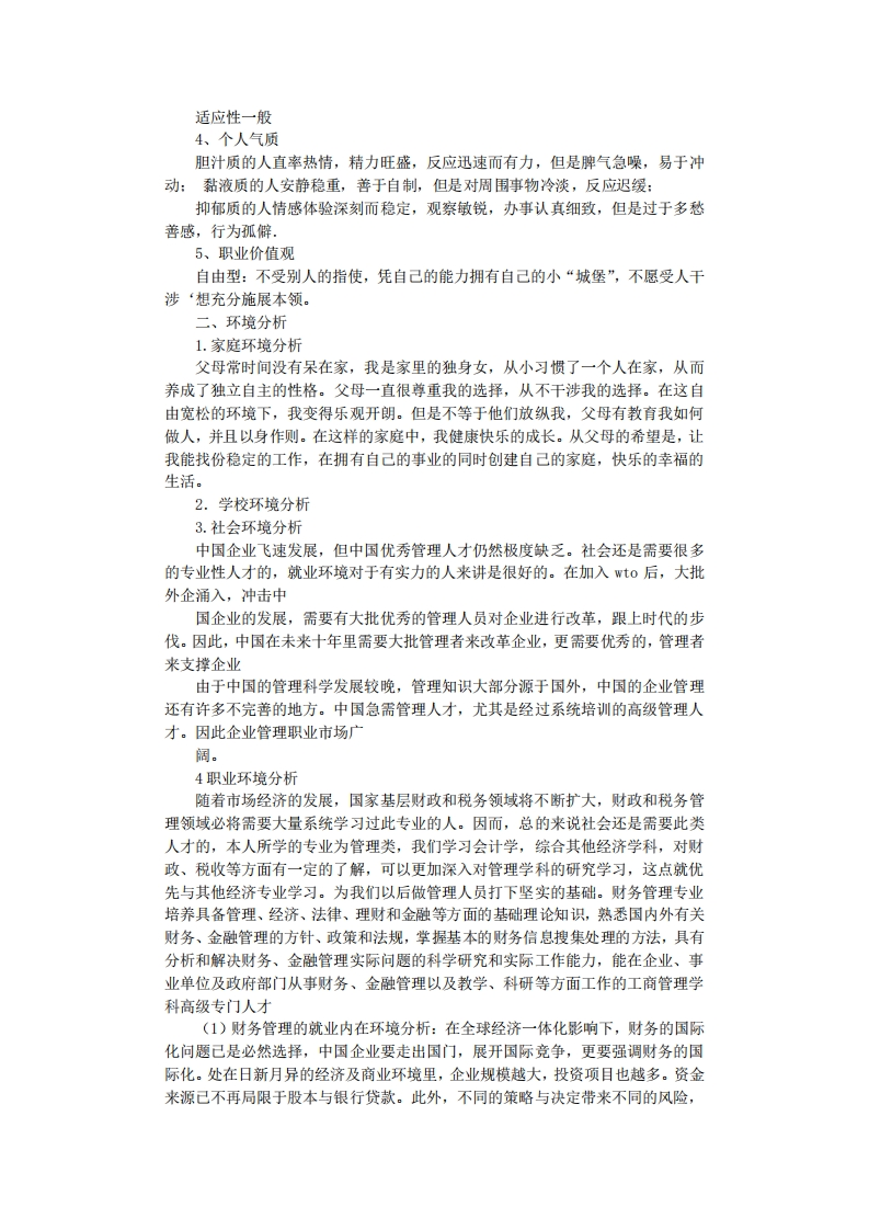 引言未来,掌握在自己手中通过一个学期大学生职业生涯规划课的学习,了解到职业生涯是一个人一生中所有与职业相联系的行为与活动,以及相关的态度、价值观、愿望等的连续性经历的过程,也是一个人一生中职业、职位的变迁及工作理想的实现过程一个人不能靠自己的能力改变命运的人,是不幸的。我们应该清楚,也必须清楚,我们能做什么,要做什么。上天之会眷顾有所准备的人,与其消极被动的承受,不如积极乐观的应对,为人生构制理想的蓝图,并为之坚持,为之充实,为之进取。职业规划是人生规划的第一步,也是实现人生其他规划的基础。走好每一步,这就是你的人生。我始终相信着,态度决定一切。我会用我的态度去争取我的生活。一.自我认识1、个人基本情况(1)2009年一一至今就读于福建农林大学金山学院财务管理专业(2)现大学二年级(3)mbti性格类型:entj(外倾直觉思维判断)(4)目标:财务总监2、职业兴趣根据霍兰德职业兴趣测验量表,我的职业倾向是s(社会型)e(企业型)a(艺术型)s一典型性格和职业特征(1)往往有较强的社会责任感和人道主义倾向,喜欢参与解决人们共同关心的社会问题和从事为他人服务和教育他人的工作:(2)通常善于表达,善于与周围的人相处:(3)一般喜欢与人而不是与事物打交道。e-一典型性格和职业特征(1)精力充沛、热情洋溢、富于冒险精神、自信、支配欲强:(2)通常追求权力、财富、地位,比较适合那些需要胆略、冒风险和承担责任的活动。(3)往往不喜欢那些需要精耕细作,以及长期智力劳动和复杂思维的工作。a一典型性格和职业特征1、喜欢以各种艺术形式的创作来表现自己的才能,实现自身的价值:2、想象力丰富,创造力很强,喜欢凭直觉做出判断:3、独立性、自主性较强:4、感情丰富,敏感,情绪易波动:适合的工作:娱乐活动管理员、国外服务办事员、社会服务助理、一般咨询者、宗教教育工作者3、职业能力及适应性兴趣是一个人从事何种职业的导向,而能力则是他能否从事这种职业的必要条件。就我对自己的了解而言,首先,我觉得我的能力表现在沟通与组织能力。在多人参加的工作中我喜欢以效率为先认真进行每一个步骤。我相信每个人的时间都是宝贵的,要如何让每个人都发挥自己的长处把工作做到最好这个是关键。在工作中发生临时状况,解决问题的能力也是重要的。其次,在理财方面我也有一定的能力。从小对数学就有一定的敏感度。特别对理财方面。同时,我也希望自己各方面的能力兼备一点,尽量做到全方位,不在某一方面吃亏。因为能力可以是培养的,劣势也有可能变成优势。