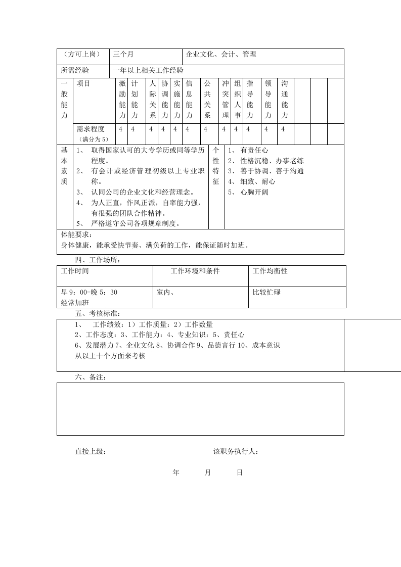 财务经理职务说明书一、基本资料资料编号:0031、职务名称:财务经理2、直接上级:财务总监3、所属部门:财务中心4、工资等级:A职系五等5、工资水平:6、分析日期:99.47、辖员人数:8、定员人数:1人9、工作性质:管理人员10、分析人员:11、批准人:二、工作内容1、工作概要负责财务中心的日常财务工作的管理、协调、帐务处理、资金调配及工商税务方面的工作2、职务说明(逐项说明工作任务、职责、权限、时间消耗)编号工作内容及职责权限耗时(%)1负责公司日常帐务处理工作及各类财务报表的编制。决定负责组织和协调财务中心日常会计核算工作,保证会2计核算流程正常运转。决定负责指导出纳人员、统计人员、信用管理员的事务性3工作。决定负责协调与公司其它各部门的财务相关事宜。4负责IBM蓝色报表的编制及报送工作。决定5负责公司纳税申报工作。决定6负责编制现金流量表,定期向财务总监提交财务分析决定7报告。完成财务总监临时交办的财务工作。8领导3工作关系:所施监督对所属的比价员、出纳、信用管理员、统计员进行管理所受监督财务总监职位关系可直接升迁的职位财务总监可相互转换的职位线经理可升迁至此的职位比价员、信用管理员、统计员、出纳三、任职资格:所需学历及最低学历专业其他说明专业大本以上学历会计其他专业同等学历也可所需技能培训培训时间培训科目