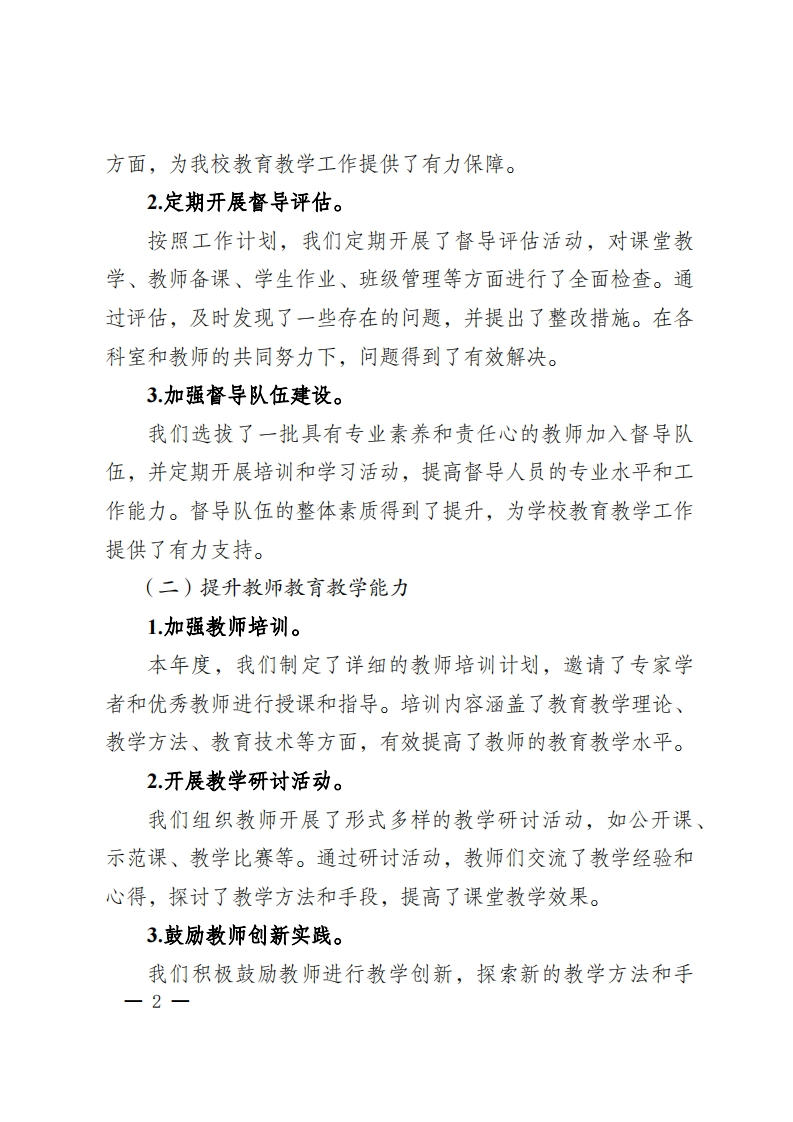 什邡市实验小学什邡市实验小学督导室2024年工作总结2024年,在市教体局的正确领导下,我校督导室紧紧围绕提升教育教学质量和促进学生全面发展这一核心目标,积极开展各项工作。一年来,我们充分发挥督导职能,强化内部管理,推动课程改革,提高教师素质,确保了学校教育教学工作的有序进行。现将本年度督导室工作总结如下:一、工作回顾(一)建立健全督导评估体系1.完善评估指标体系。本年度,我们结合学校实际情况,对督导评估指标体系进行了修订和完善,确保评估内容更加全面、科学、客观。新的评估体系涵盖了教学质量、学生发展、教师队伍、学校管理等多个一1