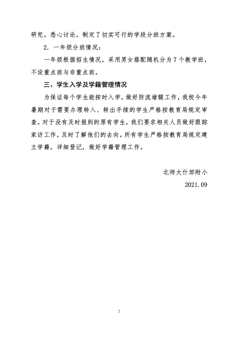 北师大什邡附小2021年开学分班情况自查报告根据市教育局安排部署,我校于2021年9月1日正式开学,为了充分做好开学准备工作,学校领导班子成员及后勤人员于8月27日开始全部上班,当天上午,召开校委会,分析上学期学校工作中的得失,进一步统一思想,并讨论制定本学期的工作安排。学校各处室制定本学期计划,并且要求各处室计划在制定的同时一定考虑到与学校的发展规划有机结合,做到相互关联,切实把学校发展规划落到实处。8月28日,学校校委会全体成员及一年级老师根据教育局的安排,紧张有序地进行了一年级开学的准备工作,召开了一年级分班工作会,8月29日下午两点开始分班。8月30日一年级新生顺利报名,学校领导班子成员赴各班检查学生到位情况,当天即将书本全部发放给学生。全体教师已于今年暑期学习培训期间制定好各科教学计划并备好开学第一周的课。现将开学一年级分班情况汇报如下:一、师生到位情况:1.教师到岗情况:全校现有128教职员工全部到岗到位,全力以赴,投入到教书育人的工作中。2.学生到校情况:我校新学年一年级新生385人全部到齐。二、分班工作1.为了抓好学校的教学常规管理工作,学校领导班子潜心