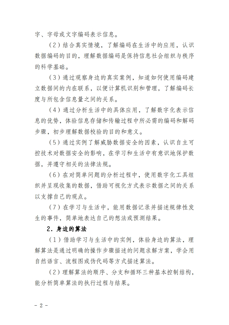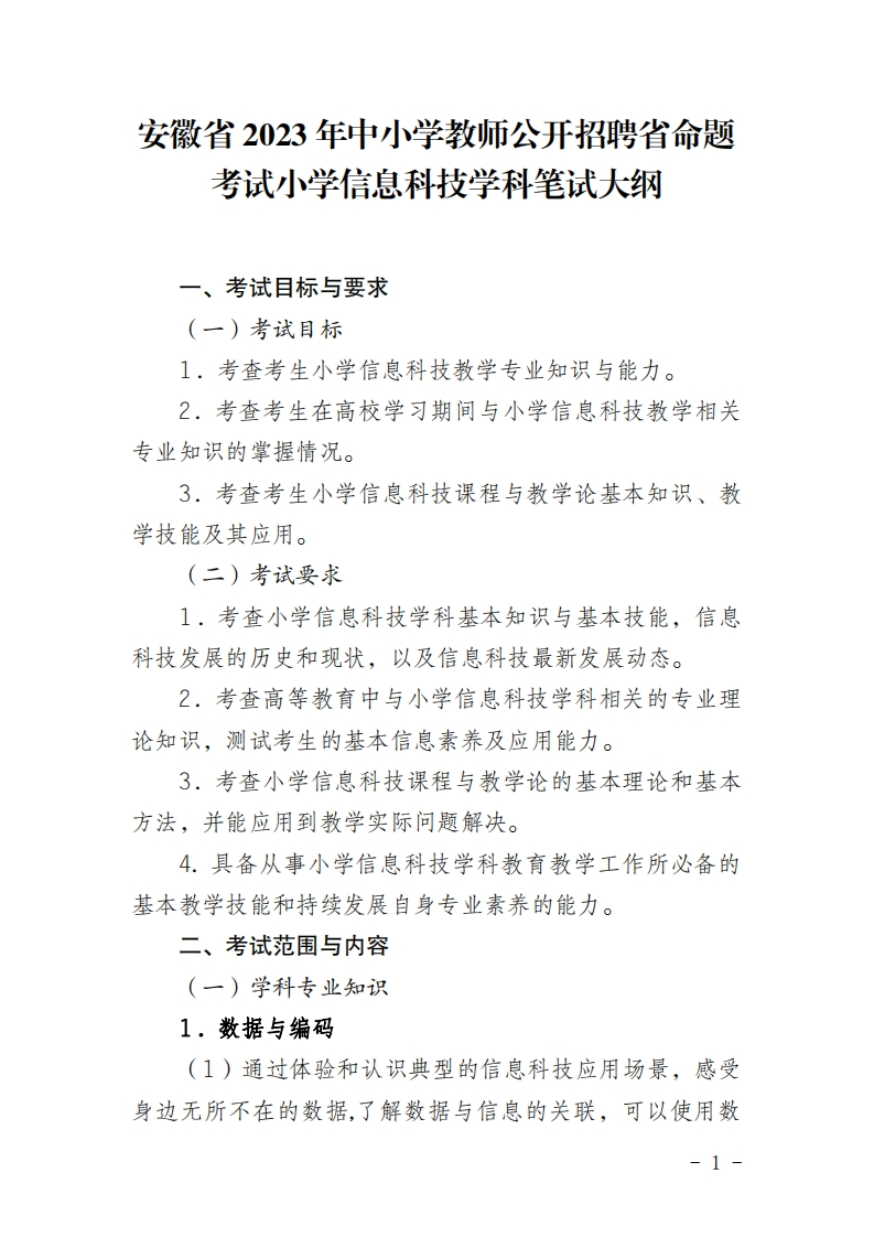 安徽省2023年中小学教师公开招聘省命题考试小学信息科技学科笔试大纲一、考试目标与要求(一)考试目标1.考查考生小学信息科技教学专业知识与能力。2.考查考生在高校学习期间与小学信息科技教学相关专业知识的掌握情况。3.考查考生小学信息科技课程与教学论基本知识、教学技能及其应用。(二)考试要求1.考查小学信息科技学科基本知识与基本技能,信息科技发展的历史和现状,以及信息科技最新发展动态。2.考查高等教育中与小学信息科技学科相关的专业理论知识,测试考生的基本信息素养及应用能力。3.考查小学信息科技课程与教学论的基本理论和基本方法,并能应用到教学实际问题解决。4.具备从事小学信息科技学科教育教学工作所必备的基本教学技能和持续发展自身专业素养的能力。二、考试范围与内容(一)学科专业知识1.数据与编码(1)通过体验和认识典型的信息科技应用场景,感受身边无所不在的数据,了解数据与信息的关联,可以使用数-1-