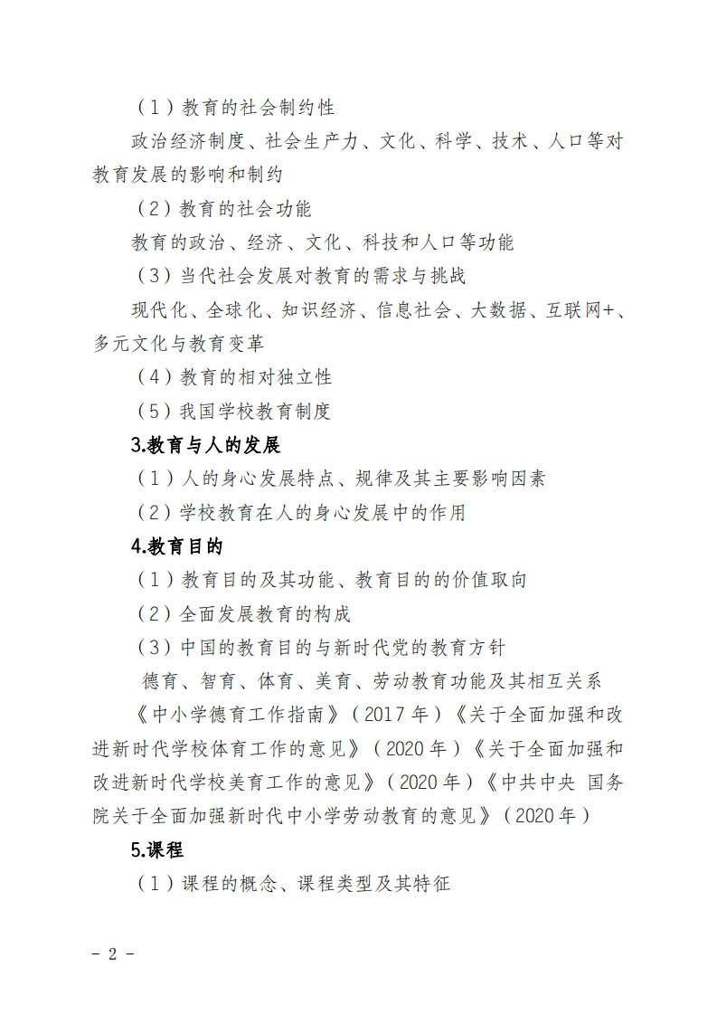 安徽省2023年中小学教师公开招聘省命题考试中学教育综合笔试大纲一、考试目标与要求以《中小学教师专业标准(试行)》和《安徽省人民政府办公厅关于加强中小学教师队伍建设的意见》(皖政办〔2012〕35号)等文件精神为依据,结合我省中小学教育教学实际,充分体现新课程改革的基本精神,为中小学补充合格师资,促进教师队伍的专业化建设。教育综合知识考试要求考生对从事教育教学所需的背景性知识、教育基础知识与基本原理有基本认知和应用能力,考核考生分析、解决教育教学实际问题的能力,考查考生从事教师职业具备的基本素养。二、考试范围与内容教育综合知识主要考查教育学、心理学、教育法律法规、课程改革政策和师德修养等5个模块的相关知识和应用能力。(一)教育学1.教育(1)教育的概念(2)教育的本质(3)教育的功能(4)教育的发展(5)教育的价值2教育与社会发展-1