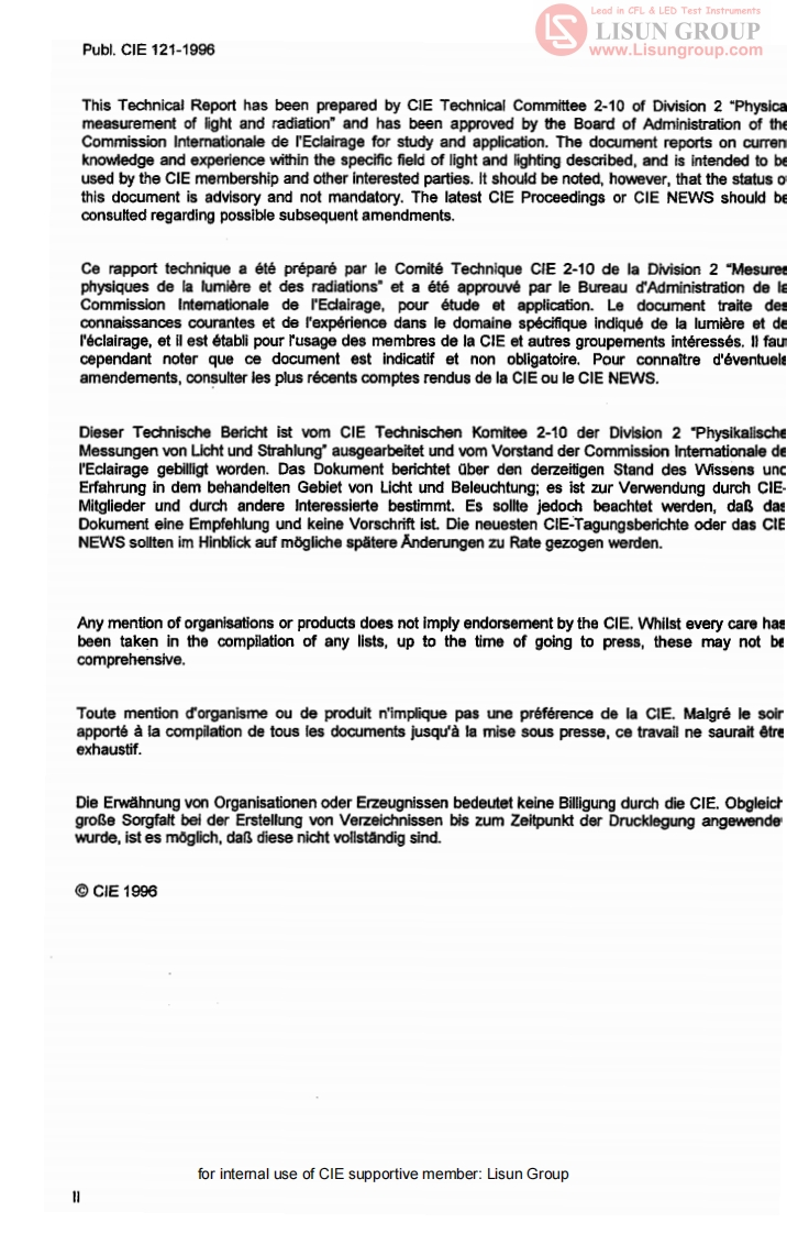 Lead in CFL LED Test InstrumentsLISUN GROUPwww.Lisungroup.comEISBN3900734747COMMISSION INTERNATIONALE DE L'ECLAIRAGEINTERNATIONAL COMMISSION ON ILLUMINATIONINTERNATIONALE BELEUCHTUNGSKOMMISSIONREPORTTHE PHOTOMETRY ANDGONIOPHOTOMETRY OFLUMINAIRESC1E121-1996UDC:535.241.427Descriptor:Light distribution628.94Luminaires681.785.4Photometers681.786Goniophotometersfor intemal use of CIE supportive member:Lisun Group
