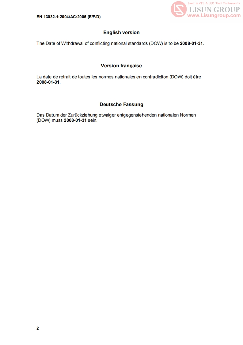 Lead in CFL LED Test InstrumentsLISUN GROUPwww.Lisungroup.comEUROPEAN STANDARDEN13032-1:2004WACNORME EUROPEENNEJanuary 2005Janvier 2005EUROPAISCHE NORMJanuar 20051CS17.180.20:29.140.01English versionVersion FrancaiseDeutsche FassungLight and lighting-Measurement and presentation of photometric data oflamps and luminaires-Part 1:Measurement and file formatLumiere et eclairage-Mesure etLicht und Beleuchtung Messung undpresentation des donnees photometriquesDarstellung photometrischer Daten vondes lampes et des luminaires-Partie 1:Lampen und Leuchten-Teil 1:MessungMesurage et format de donneesund DatenformatThis corrigendum becomes effective on 26 January 2005 for incorporation in the three officiallanguage versions of the EN.Ce corrigendum prendra effet le 26 janvier 2005 pour incorporation dans les trois versionsling uistiques officielles de la EN.Die Berichtigung tritt am 26.Januar 2005 zur Einarbeitung in die drei offiziellen Sprachfassungen derEN in Kraft.EUROPEAN COMMITTEE FOR STANDARDIZATIONCOMITE EUROPEEN DE NORMALISATIONEUROPAISCHES KOMITEE FOR NORMUNGManagement Centre:rue de Stassart,36 B-1050 Brussels@2005CENAll rights of exploitation in any fomm and by any means reserved worldwide for CEN national Members.Tous droits d'exploitation sous quelque fomme et de quelque maniere que ce soit reserves dans le monde entier auxmembres nationaux du CEN.Alle Rechte der Verwertung,gleich in welcher Form und in welchem Verfahren,sind weltweit den nationalen Mitgliedernvon CEN vorbehalten.Ref.No.:EN13032-1:2004/AC:2005D/E/F